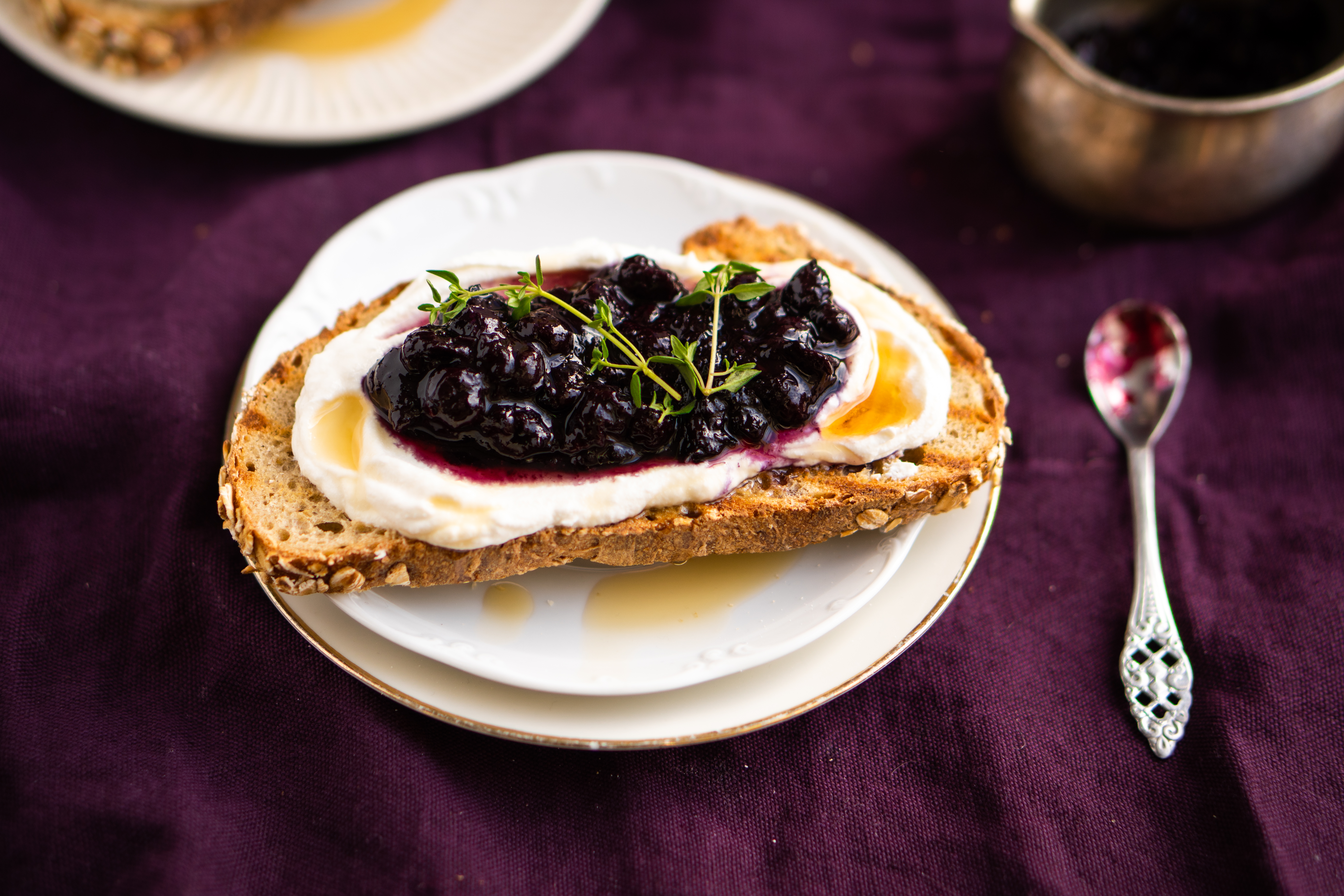 Bestrijk de toast met de ricotta en schep er een klodder van de blauwebessencompote op.