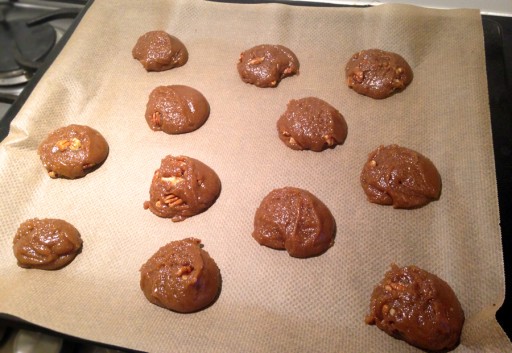 Maak bolletjes van het koekjesdeeg, dat gaat het handigste met een ijslepel. Plaats de bolletjes op een met bakpapier beklede bakplaat. Let op: laat flink ruimte zitten tussen de koekjes, zodat ze niet tegen elkaar aan bakken.