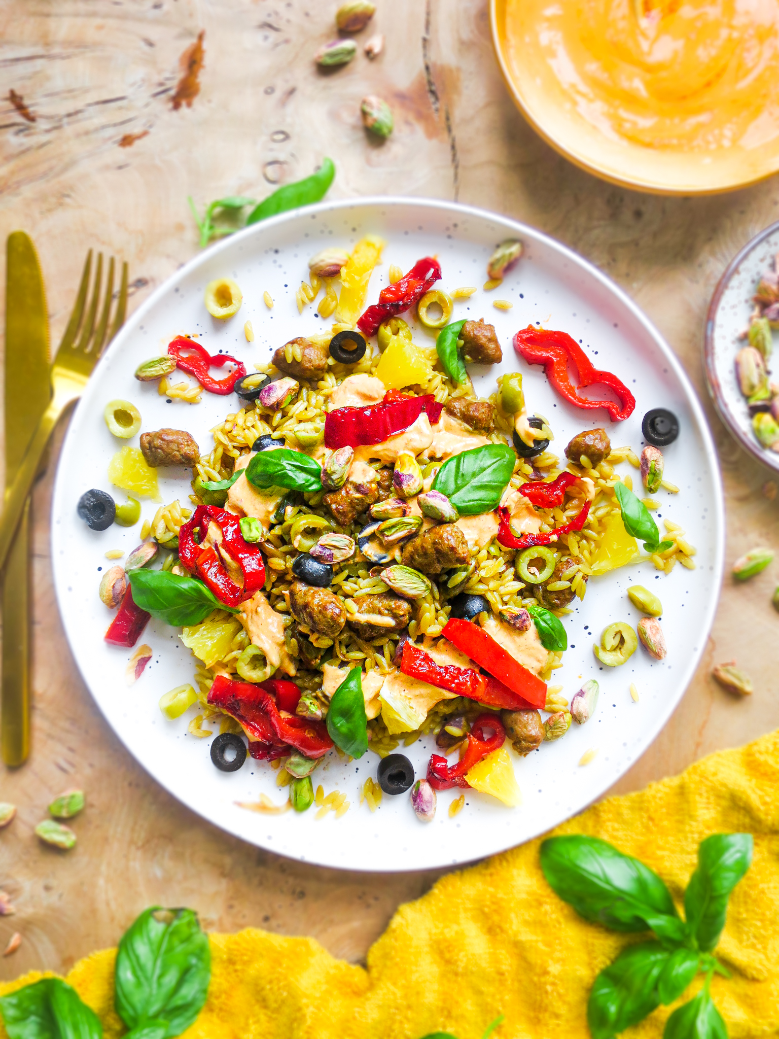 Orzo met merguez, olijven, pistache en harissayoghurt