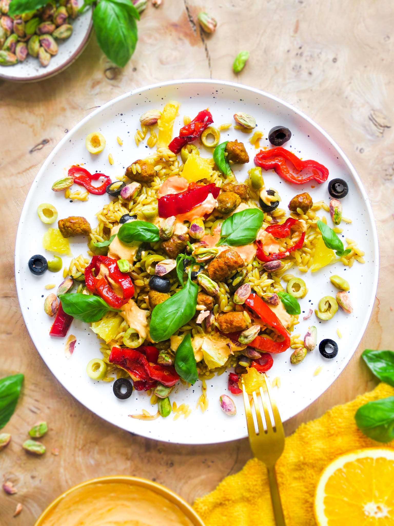 Orzo (ook wel riso of Griekse pasta genaamd) is nog het beste te omschrijven als pasta in de vorm van rijstkorrels. Het product wordt zowel in de Italiaanse als in de Arabische keuken gebruikt en in dit gerecht laten we die twee keukens mooi samenkomen.
