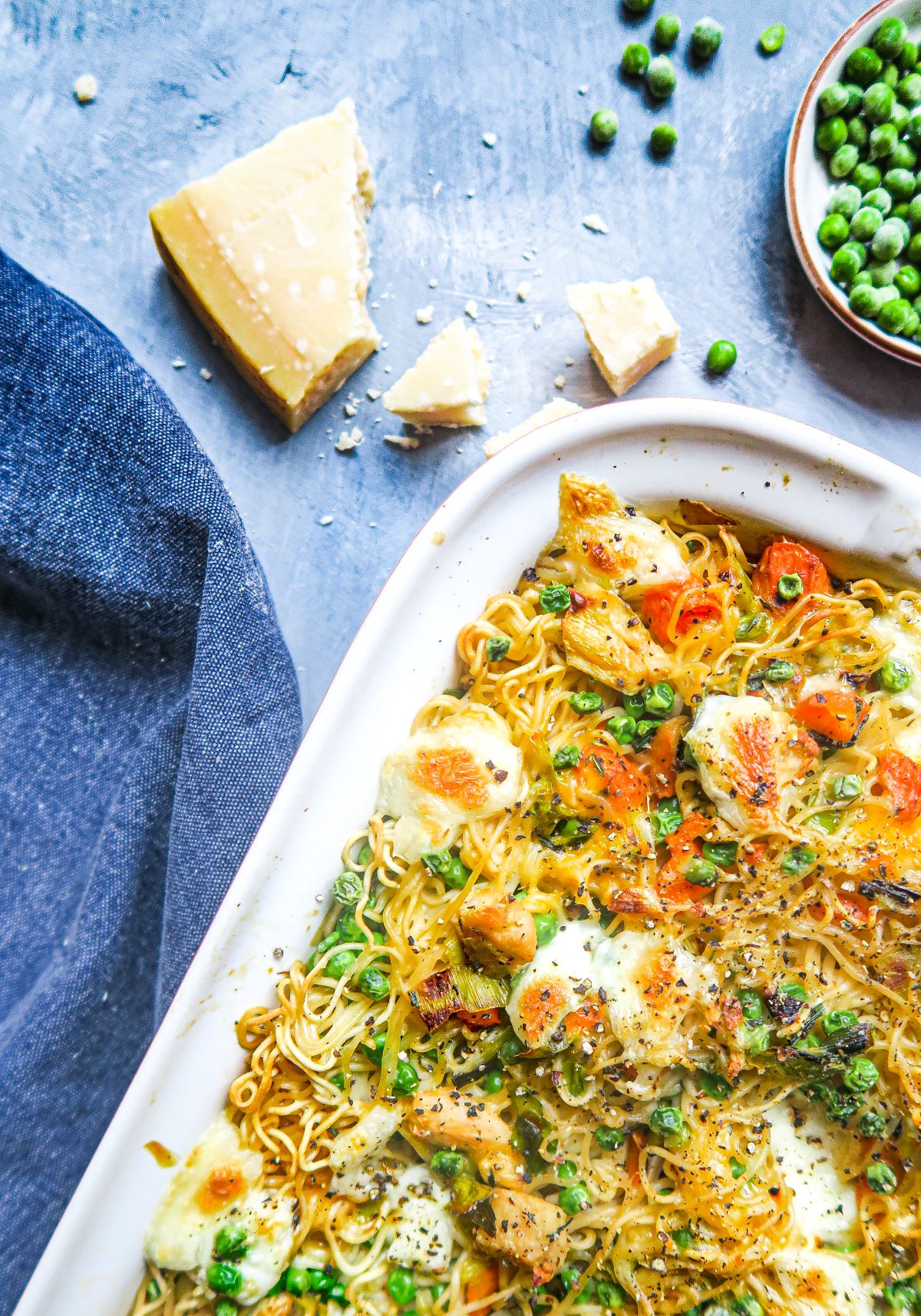 We durven te wedden dat zelfs de lastigste eters (pointing at you, children) deze ovenschotel goddelijk gaan vinden. Met sappige stukjes kip, een lekkere bite door de wortel en de erwten, een romig bouillonsausje en stukjes Cheddar kan dat haast niet anders.