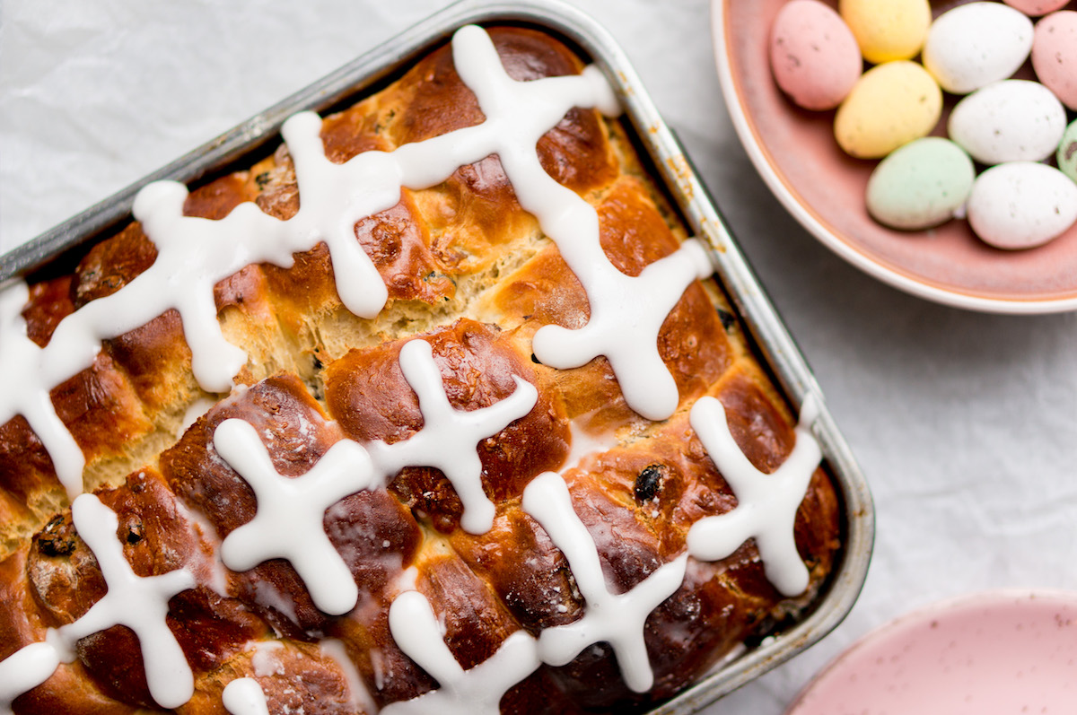 Hot cross buns (Engelse paasbroodjes) zijn vergelijkbaar met krentenbollen, maar dan met een lekker krokant korstje en een boterige smaak. Het lekkerste is misschien wel het kruis van glazuur (daar komt de naam vandaan…) dat bovenop de broodjes gaat.