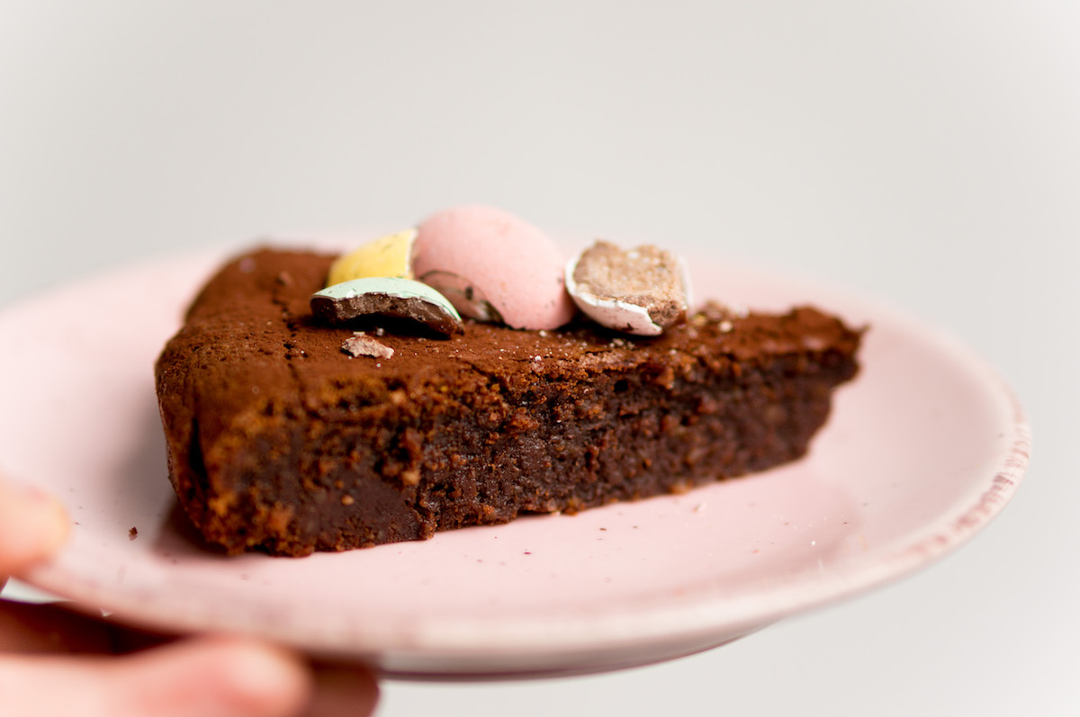 Deze paastaart steelt de show tijdens je paasbrunch! En het mooiste: deze chocoladetaart is ontzéttend makkelijk (en snel) te maken. Het is een chocoladetaart zonder bloem: in plaats daarvan gebruiken we een mengsel van fijngemalen bitterkoekjes en amandelen. Ontzéttend lekker.