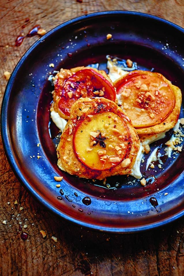Georgina Hayden is de senior food stylist van Jamie Oliver. En nu heeft ze een eigen boek: Slow. Een prachtig kookboek waarin niet alleen de recepten centraal staan, maar waar het vooral draait om het hele proces van de voorbereidingen tot het koken tot het uiteindelijk samen opeten van de maaltijd. We mogen een lekker recept uit dit boek met jullie delen: pannenkoekjes met gekarameliseerde appel, ricotta en hazelnoot.