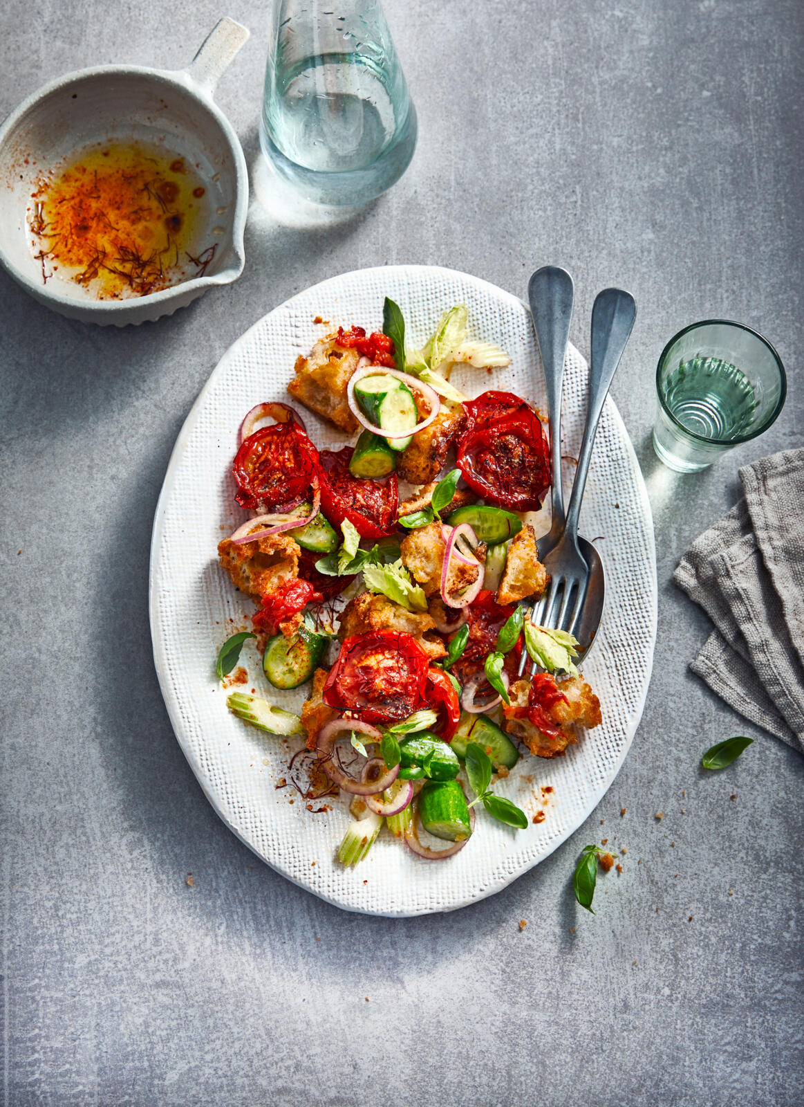 Panzanella met honing-saffraantomaten, komkommer en gepekelde rode ui