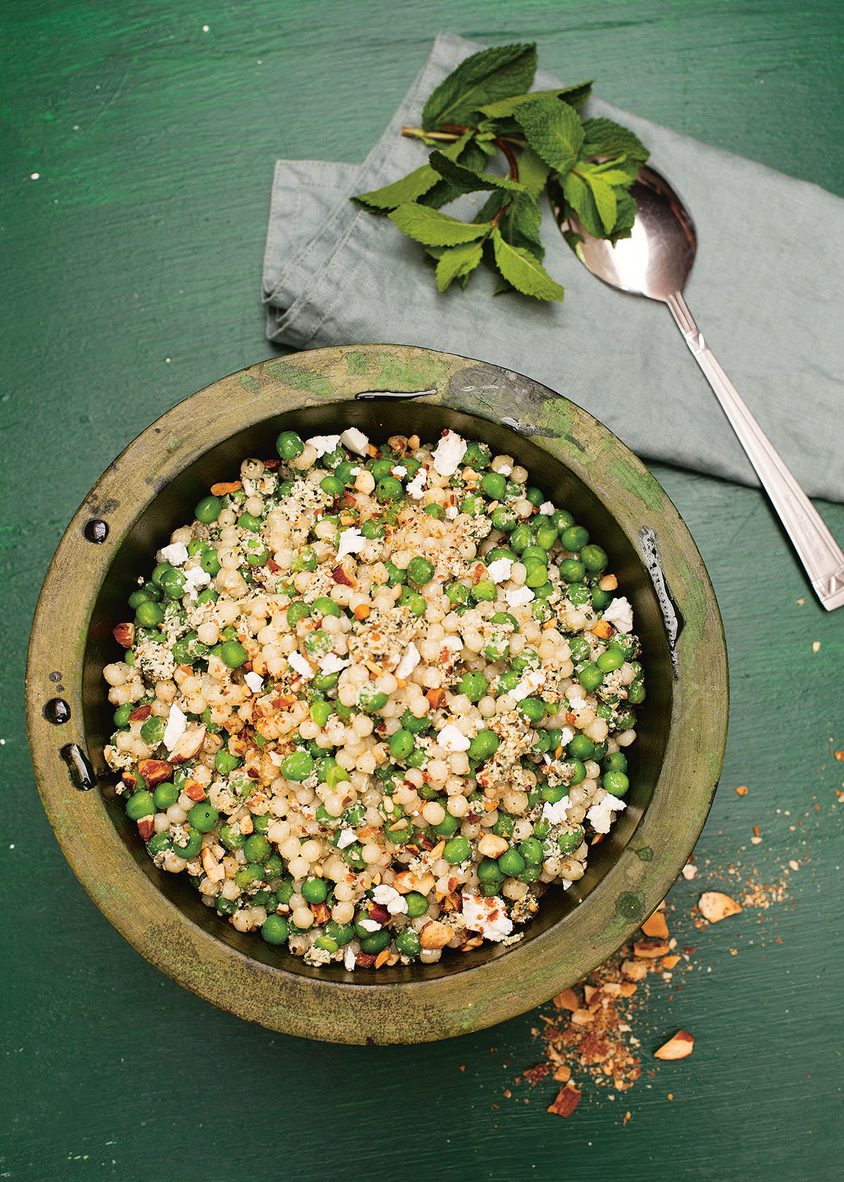 Meng vlak voor het serveren de parelcouscous met de doperwten, de amandelen, het citroensap, een scheutje olijfolie en wat van de muntpesto. Schep in een kom of schaal en geef de rest van de muntpesto en verse munt erbij.