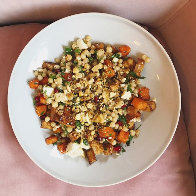 Parelcouscoussalade met zoete aardappel, feta & granaatappel