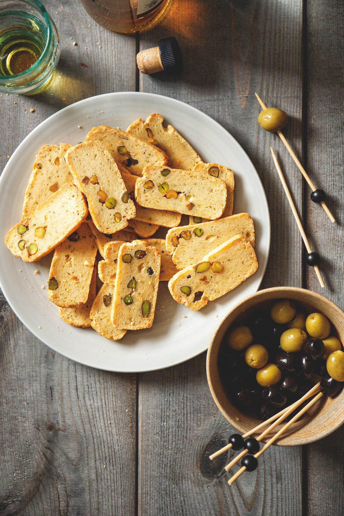 Janny: “Deze hartige koekjes (biscotti, oftewel ‘tweemaal gebakken’) smaken heerlijk bij een glas wijn. Ze zijn lang houdbaar in een goed afsluitbaar blik of trommel. Als het deeg na de eerste bakronde in dunnere plakjes wordt gesneden, krijg je een soort melba-achtige toast.”