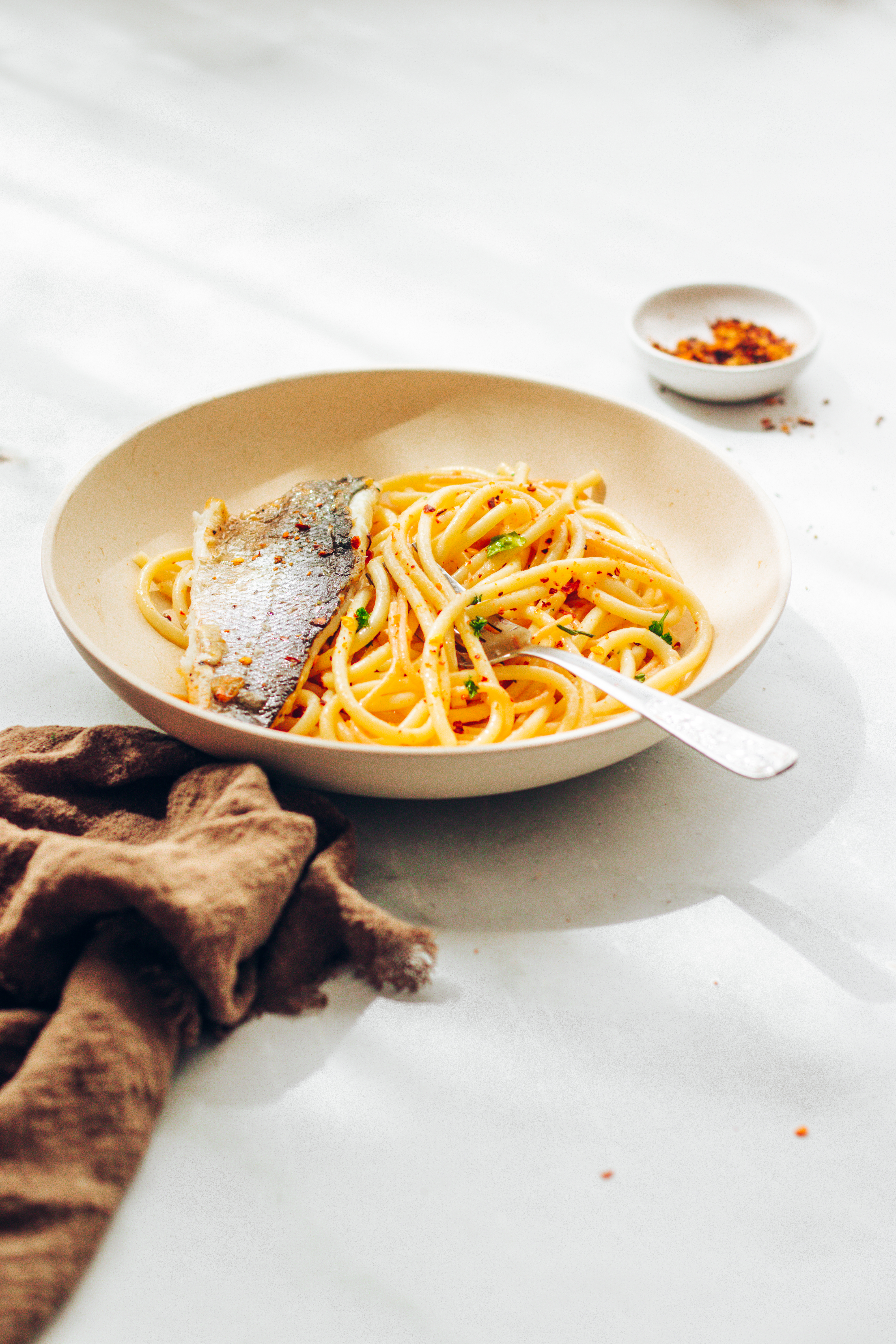 De hoofdrol in deze aglio e olio is zelfs met een stuk vis van goede kwaliteit nog altijd weggelegd voor de olijfolie. Trek daarom je beste fles olijfolie uit de kast, want kwaliteit maakt het verschil.