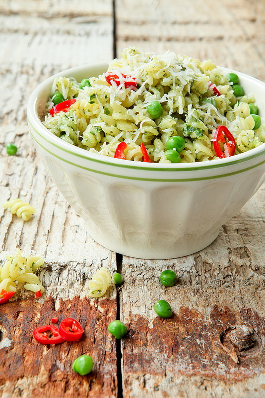 Een superzomers gerecht van een van onze favoriete culy blogs Photo-Copy Ann: Pasta met pesto van doperwtjes en munt.