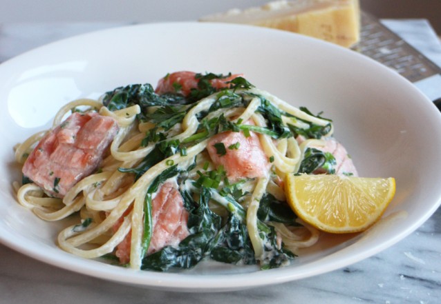 Snelle pasta met spinazie, kruidenkaas en zalm
