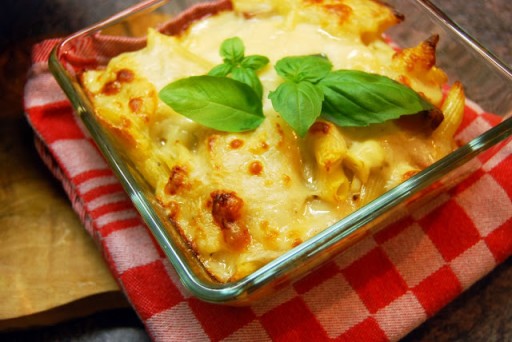 Kieper de pasta in een ovenschaal en giet de bechamelsaus erover. Bestrooi met de rest van de Parmezaanse kaas en bak 20 minuten in de oven tot de schotel mooi goudbruin is. Bestrooi met verse basilicumblaadjes en serveer met een frisse salade.
