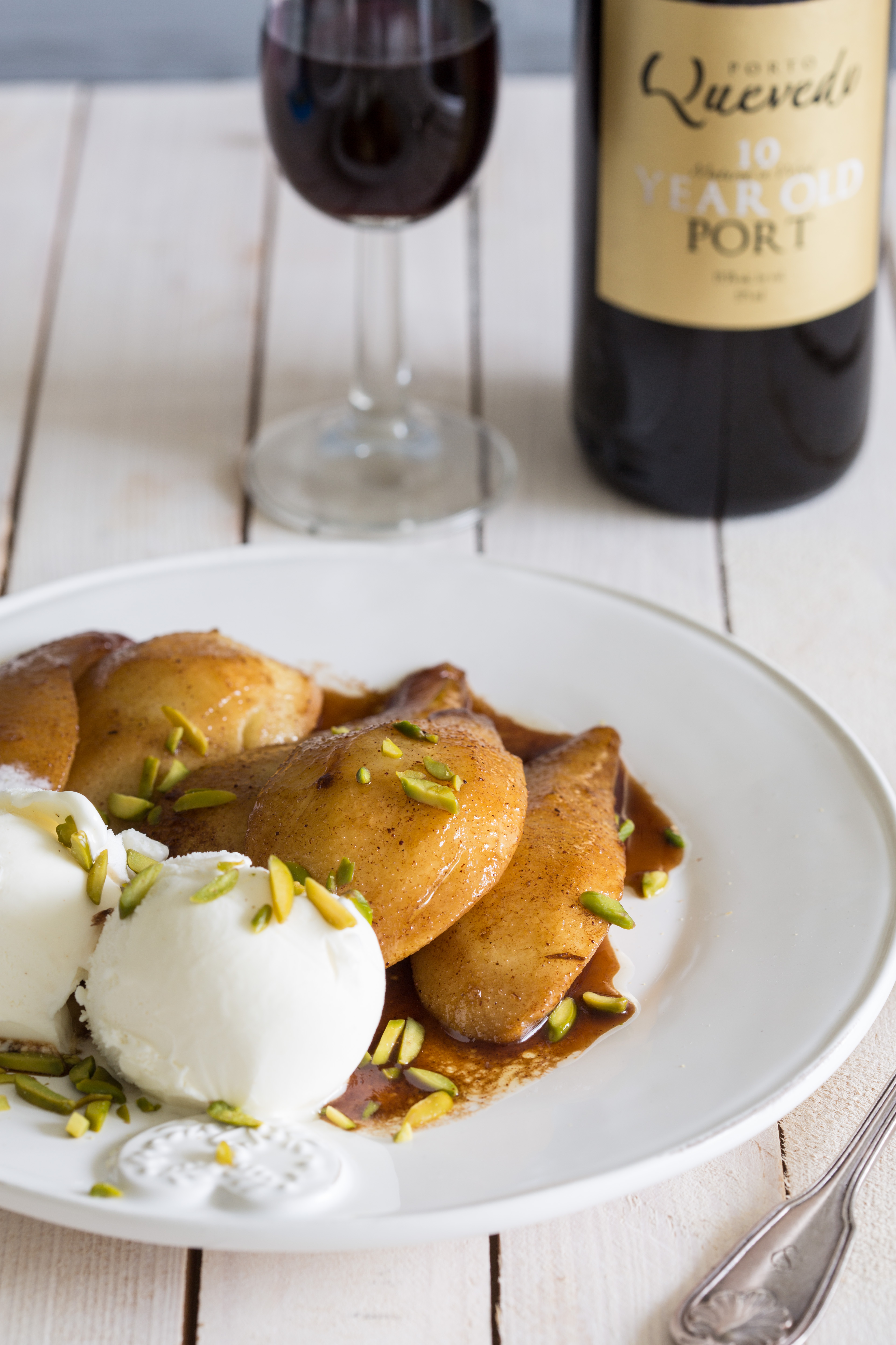Peren met portsaus, vanille-ijs en pistachenootjes