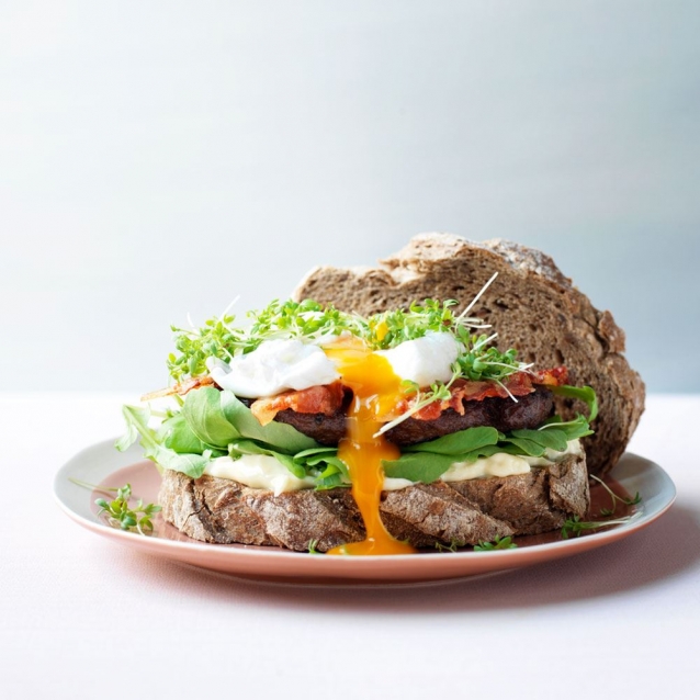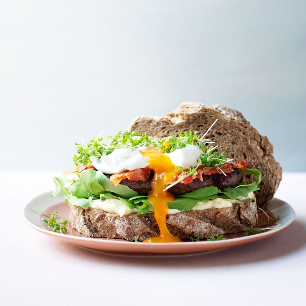 Beleg met rucola, hamburger, spek, ei en tuinkers en doe de andere boterham bovenop. Herhaal dit ook voor de andere 3 burgers.