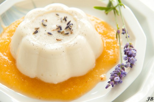 Serveer de panna cotta met de perzikenmousse en strooi er eventueel nog wat lavendelbloemetjes op.