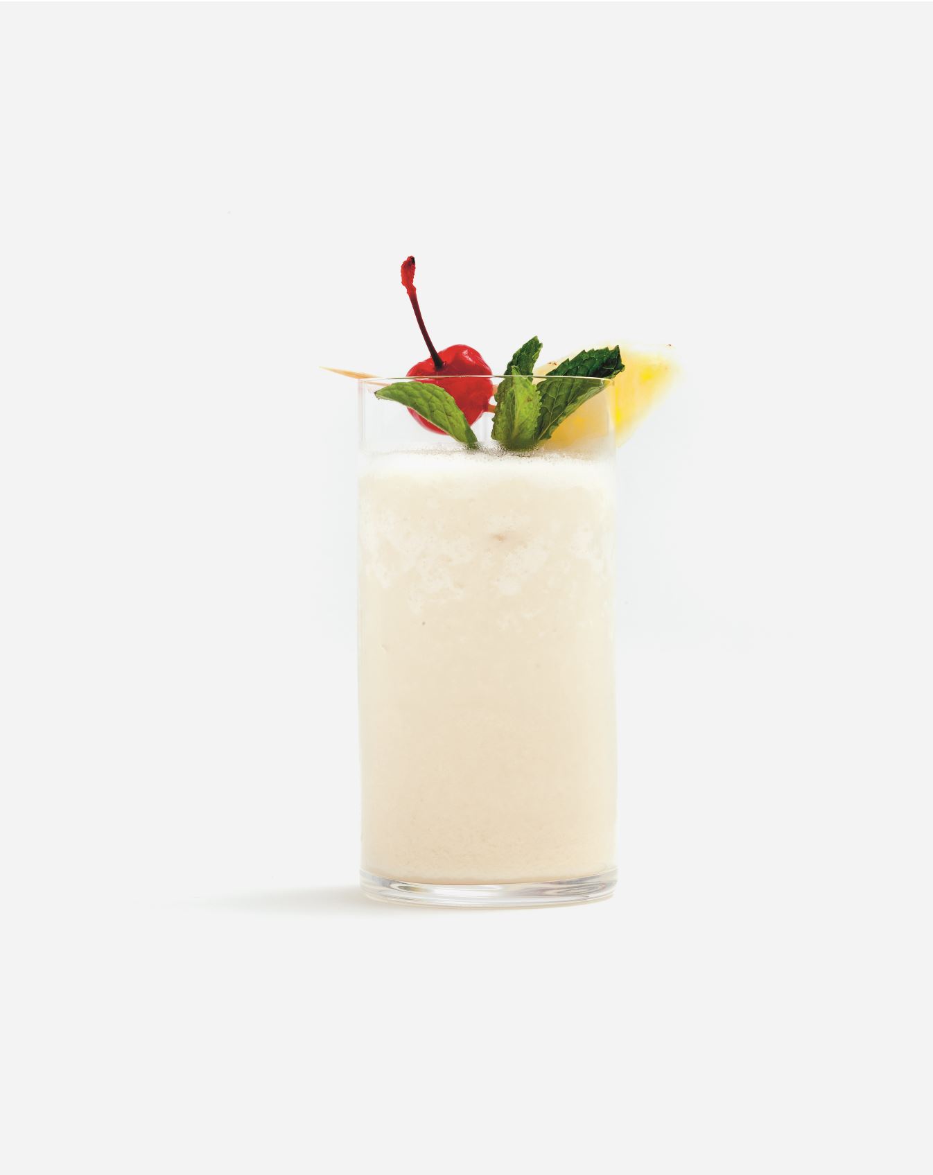 Voor deze mocktail mix je alle ingrediënten in de blender tot er een romig mengsel ontstaat. Giet in een groot glas en garneer met de plak ananas, de kers en de munt.