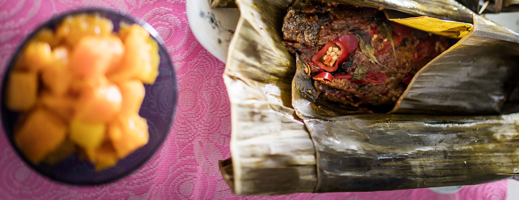 Zo maak je pittige makreelfilet met pompoen in bananenblad