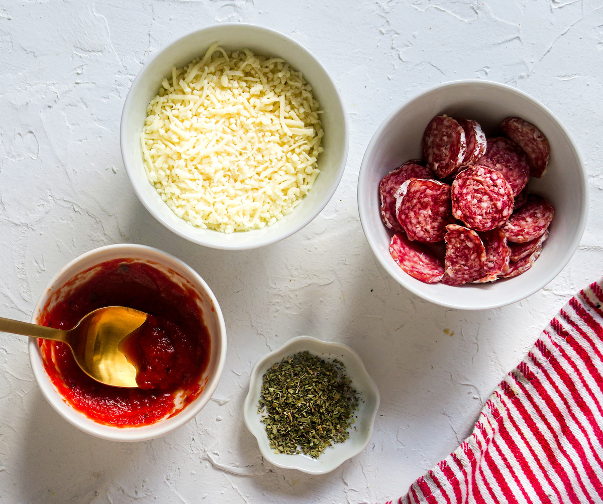 Kidsproof tip: doe de mozzarella, de salami, de tomatensaus en de oregano in kommetjes en laat de kinderen zelf hun eigen pizzatoast beleggen.