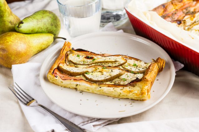 Dit recept is simpel en perfect voor een doordeweekse dag: plaatpizza met geitenkaas, peer en bacon.