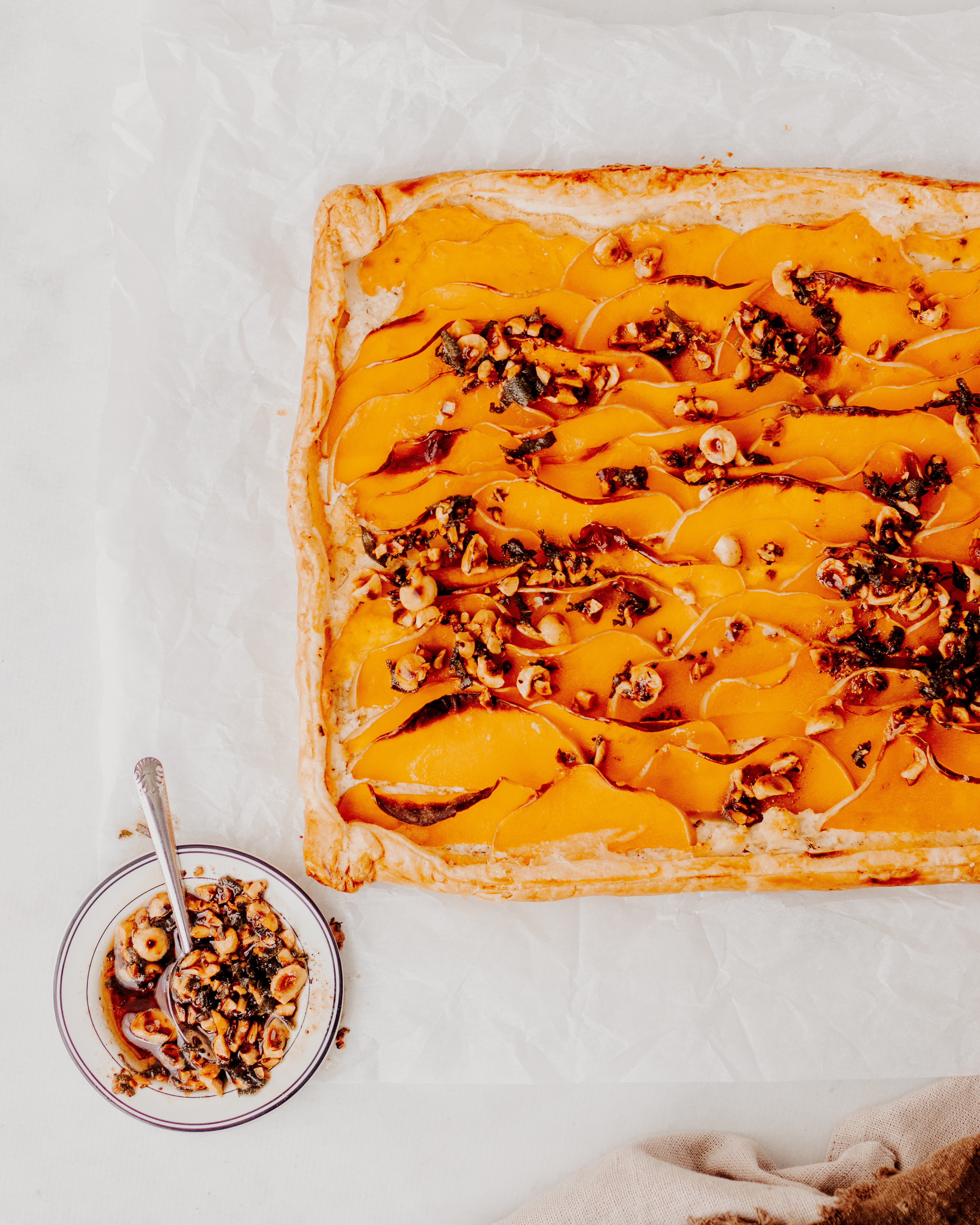 - Strooi de hazelnotencrumble over de plaattaart met pompoen voor het serveren, snijd in stukken en serveer warm of koud.