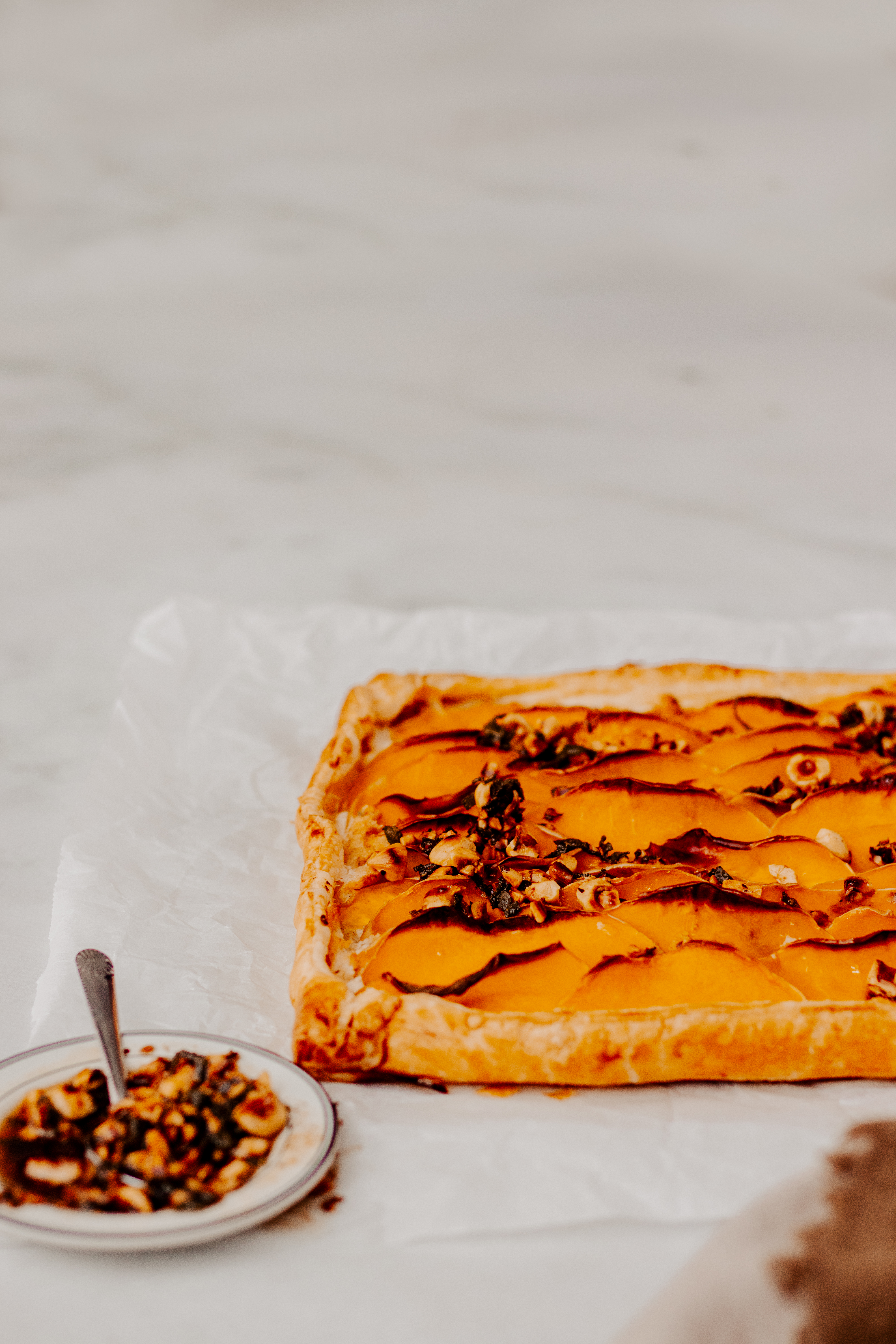 Het maken van deze plaattaart met pompoen is namelijk zo ontzettend makkelijk, dat we ‘m het liefst iedere week maken. Ricotta gaat samen met flinterdunne plakjes pompoen op de plaattaart en de oven in. Ondertussen maken we een snelle hazelnotencrumble met salie. We zijn er dol op!