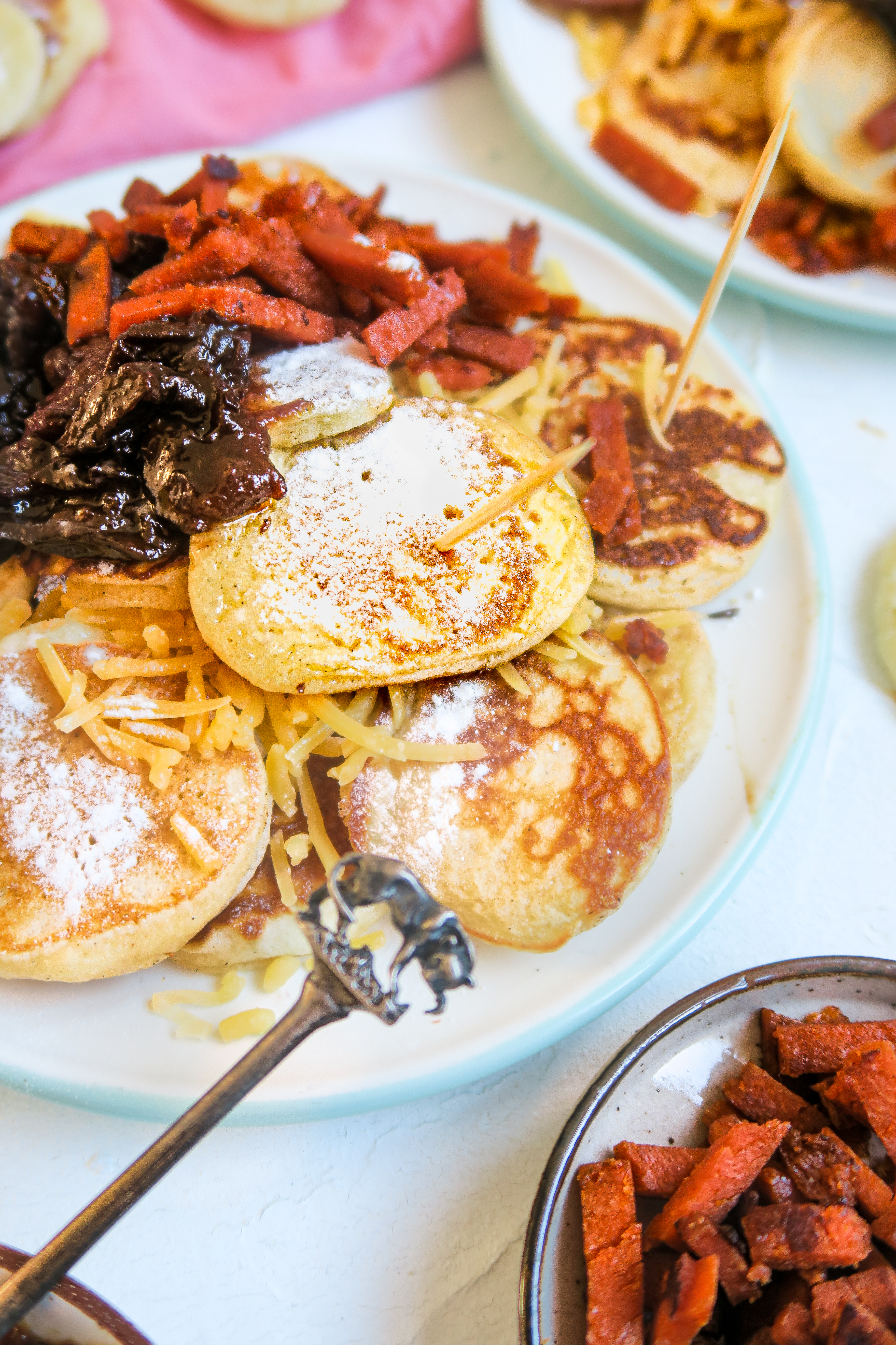 Poffertjes met kaas, pruimencompote en (vega) spekjes