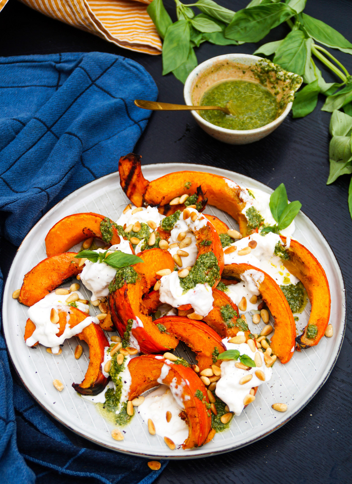 Serveer de gegrilde pompoenparten op een schaal en verdeel er lekker wat burrata en pestodressing overheen. Top af met peper en zout en opscheppen maar!