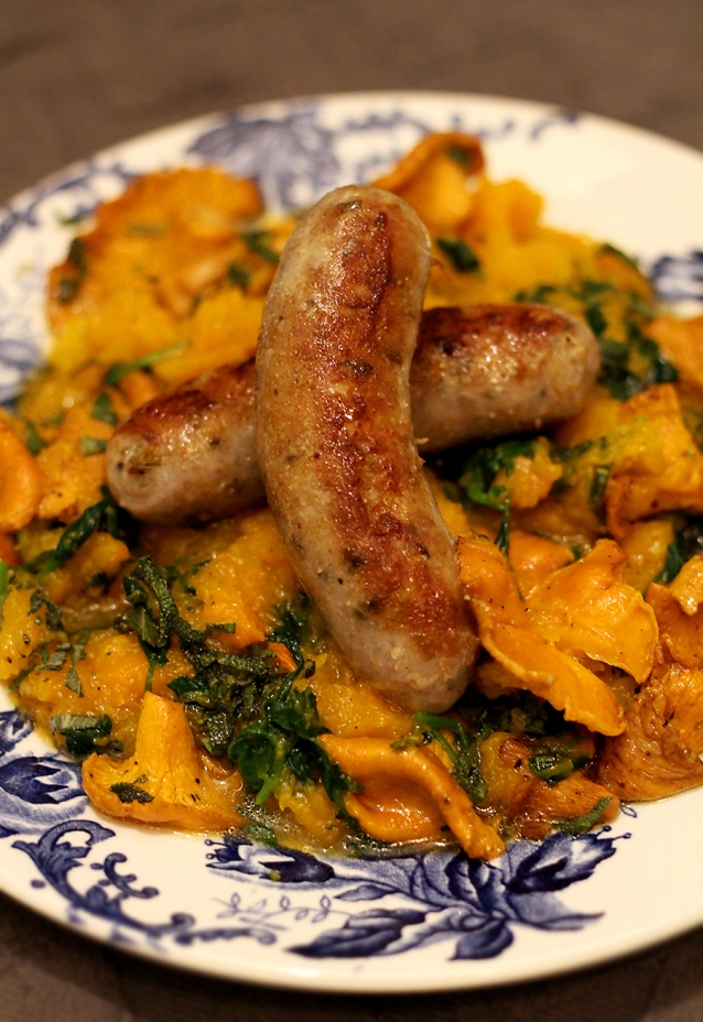 Meng de salie en cantharellen door de pompoen stamppot. Kruid het geheelĀ met peper en zout en breng op smaak met olijfolie. Serveer met de worstjes.