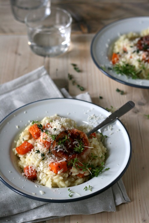 Onlangs maakte de Culy redactie deze pompoenrisotto met gebakken pancetta, geitenkaas en tijm. Het resultaat was zó waanzinnig lekker, dat we het wel met jullie moesten delen. Het recept is afkomstig van Maura’s blog Yellow Lemon Tree.