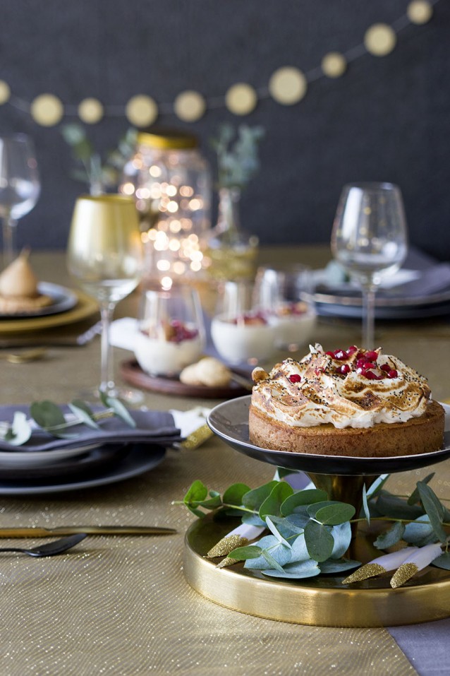 Besmeer de bovenkant van de cake nonchalant met het Italiaanse eiwitschuim en strooi de maanzaadjes erover. Brand het schuim voorzichtig goudbruin met een crème brûlée brander. Strooi als laatste de granaatappelpitjes erover.