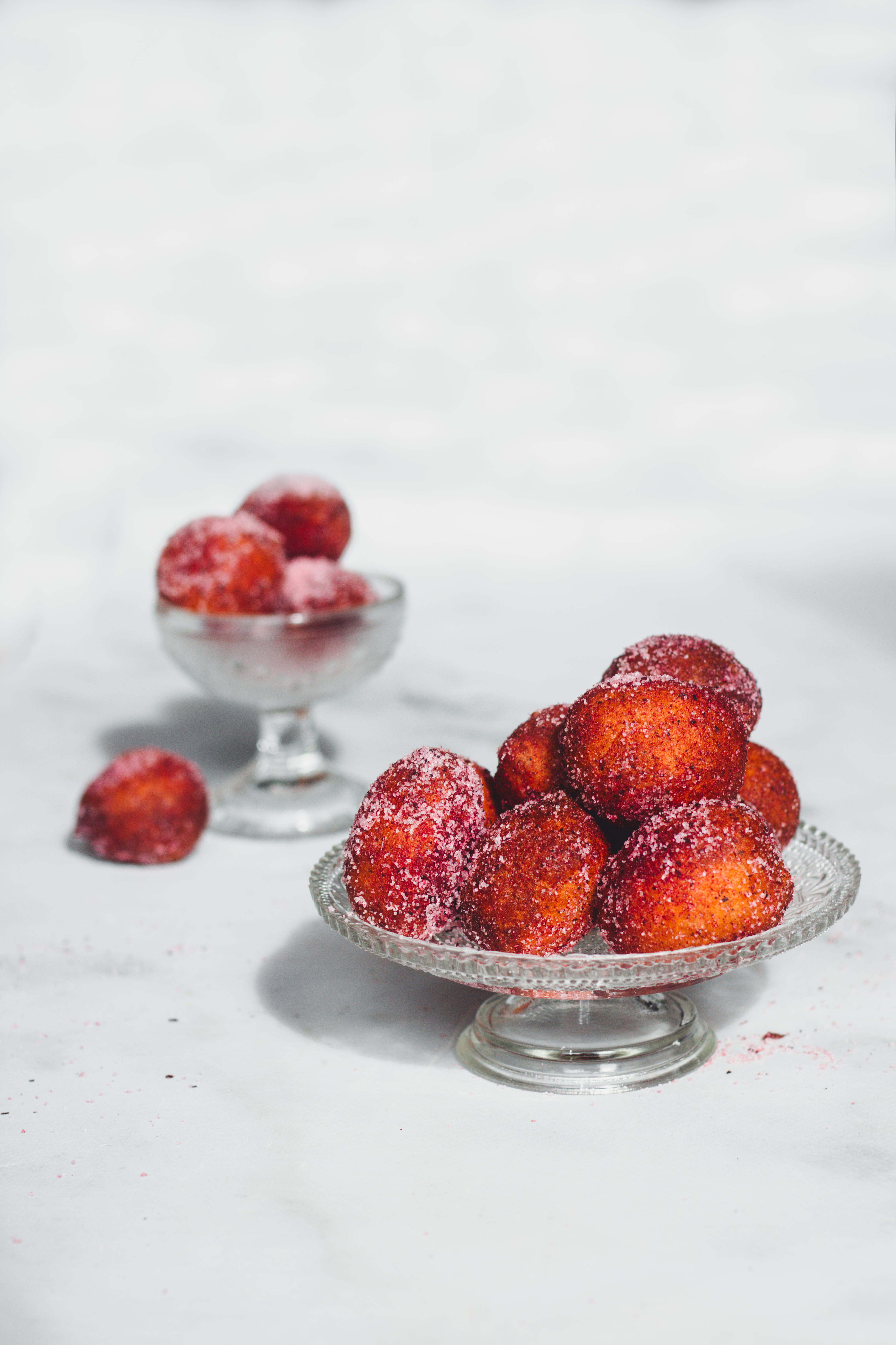 Om de West-Afrikaanse vibe aan te houden gaan we voor een hibiscussuiker: gemalen hibiscusbloemen met suiker. We schreven al eerder over deze rode bloem die je steeds vaker ziet terug komen in gerecht. Maar na het afgelopen jaar kunnen we echt van een hibiscustrend spreken. Op social media zie je het overal voorbijkomen. Eindelijk, denkt Culy’s Ogechi, zij is gek op de friszure smaak en kan niet wachten om het in meer bijzondere wijze te zien. Andere lekkere variaties zijn matchasuiker of vanillesuiker. Je kunt eventueel de snuf nootmuskaat in het deeg van de puff puff weglaten.
