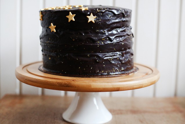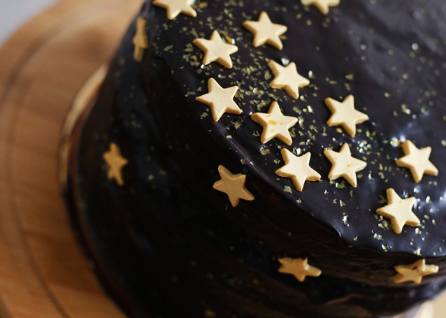 Versier de taart met eetbare sterren en gouden glitters en zet de taart weer in de koelkast. Haal de chocoladetaart met roomkaas en salted caramel twee uur voor het aansnijden uit de koelkast. De taart is ongeveer 3 dagen houdbaar.