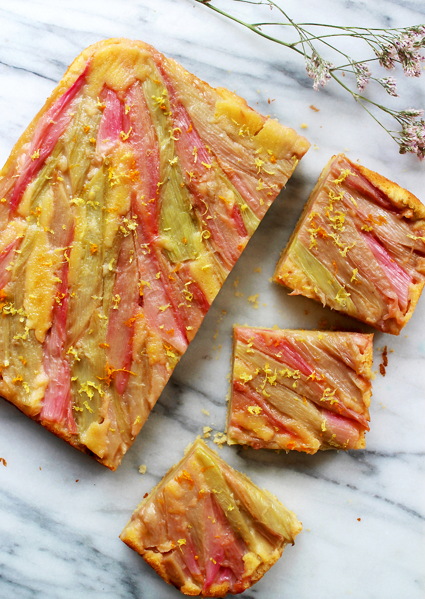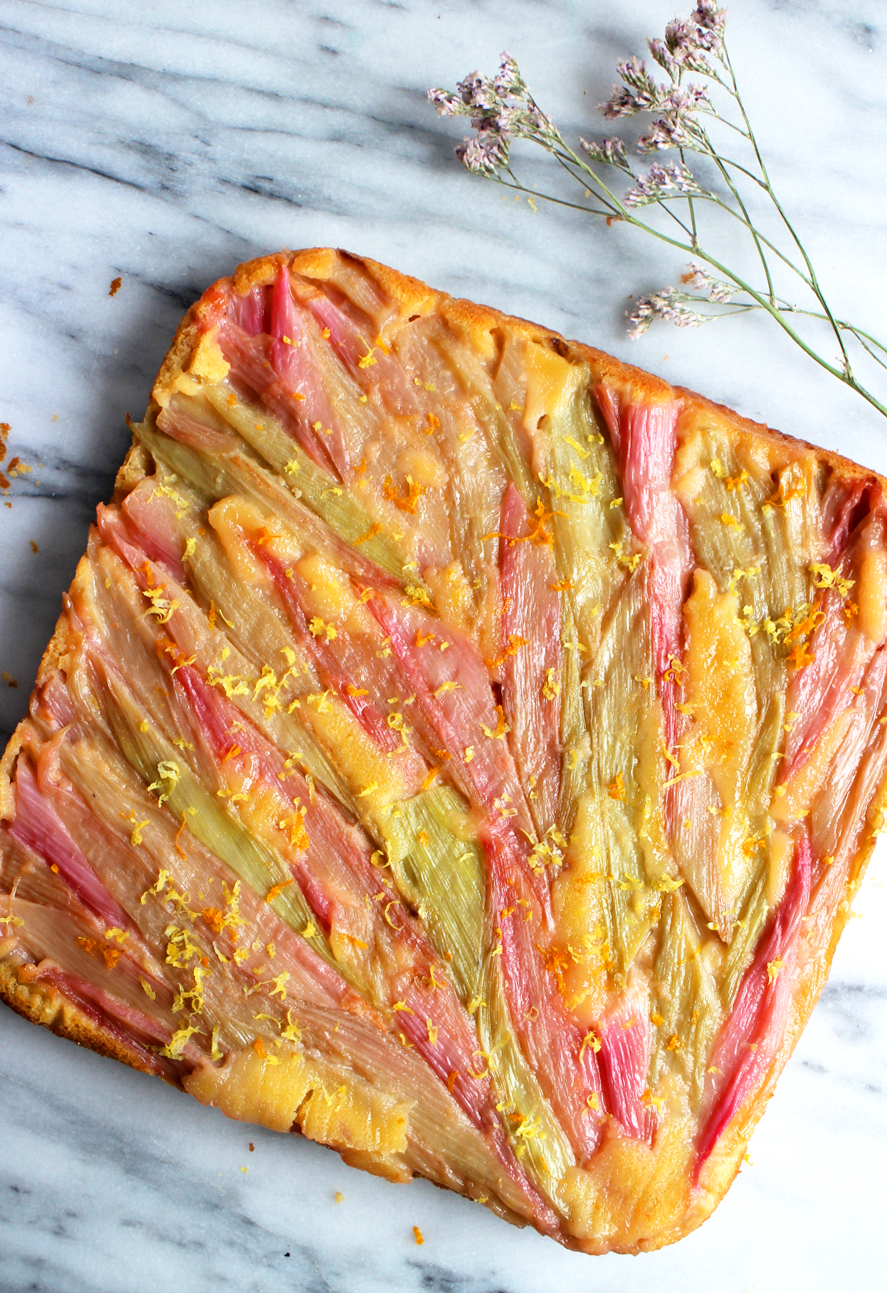 Vet een vierkante cakevorm met een doorsnee van 22 centimeter in met boter en bedek met bakpapier. Verdeel hierover de 60 gram boter, de rabarber en citroenrasp. Giet het beslag op de rabarber en verdeel de topping erover.