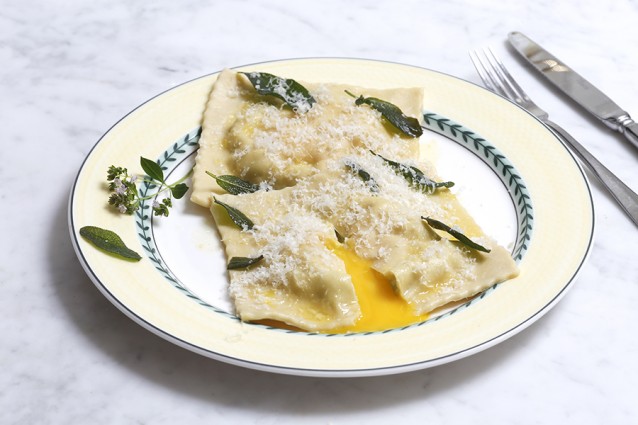Schep ze met een schuimspaan uit het water en leg ze op een bord. Smelt een klontje boter met wat fijngesneden verse salie in een pan en schep dat over de ravioli. Strooi er nog wat Parmezaanse kaas over.