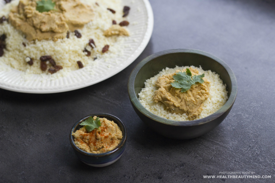 Mix het vervolgens tot een glad mengsel en dan is het klaar om opgediend te worden. Schep de pastinaakrijst op en meng er wat rozijnen door. Serveer de hummus als bijgerecht of als saus over de rijst.