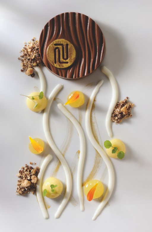 Maak eerst de taartjes. Spuit de chocolademousse in ronde siliconenvormen, leg een uitgestoken rondje biscuit van dezelfde grootte op de mousse en vries in. Haal de taartjes uit de vorm en laat ontdooien. Vermeng wat goudpoeder met een klein beetje wodka en maak golvende strepen op het bord. Maak golvende strepen van de hangop. En spuit hiertussen de citroenmousseline en citrusgel. Leg het taartje op het bord. Schep hoopjes toffeecrunch op het bord zoals op de foto en garneer verder met atsinacress en goudbloemblaadjes.
