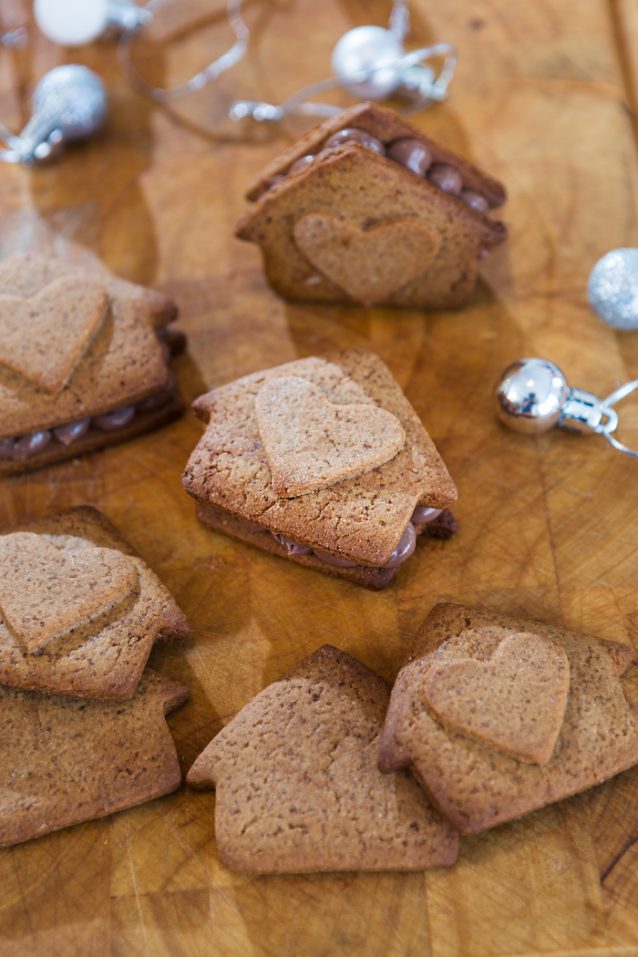 Spuit een laagje ganache op 9 gingerbread koekjes. Leg hier de andere helft van de koekjes op, zodat je de hartenhuisjes staand kunt serveren.