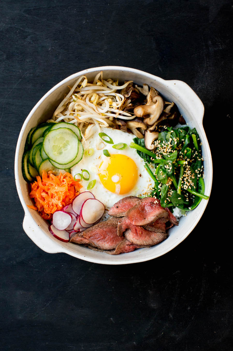 - Nu kun je voor dit bibimbap recept de kommen gaan opmaken. Schep eerst een laag rijst in de kommen en leg het gebakken ei in het midden van de kommen. Schik alle gerechten rondom de eidooier. Strooi de sesamzaadjes over de spinazie en wat bosui over het eitje.