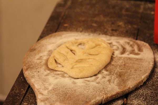 Strooi wat rijst- of maïsmeel op je werkblad. Haal het deeg na een uur uit de kom en leg op je werkblad. Verdeel je bol in vier delen en druk de kleine bolletjes plat. Smeer ze in met wat olijfolie en sprenkel er wat zeezout en nog wat extra meel over. Maak met bijvoorbeeld een mesje inkepingen in het deeg zoals je op de afbeelding ziet. Rek het deeg iets uit en leg het op een stuk bakpapier op de bakplaat.