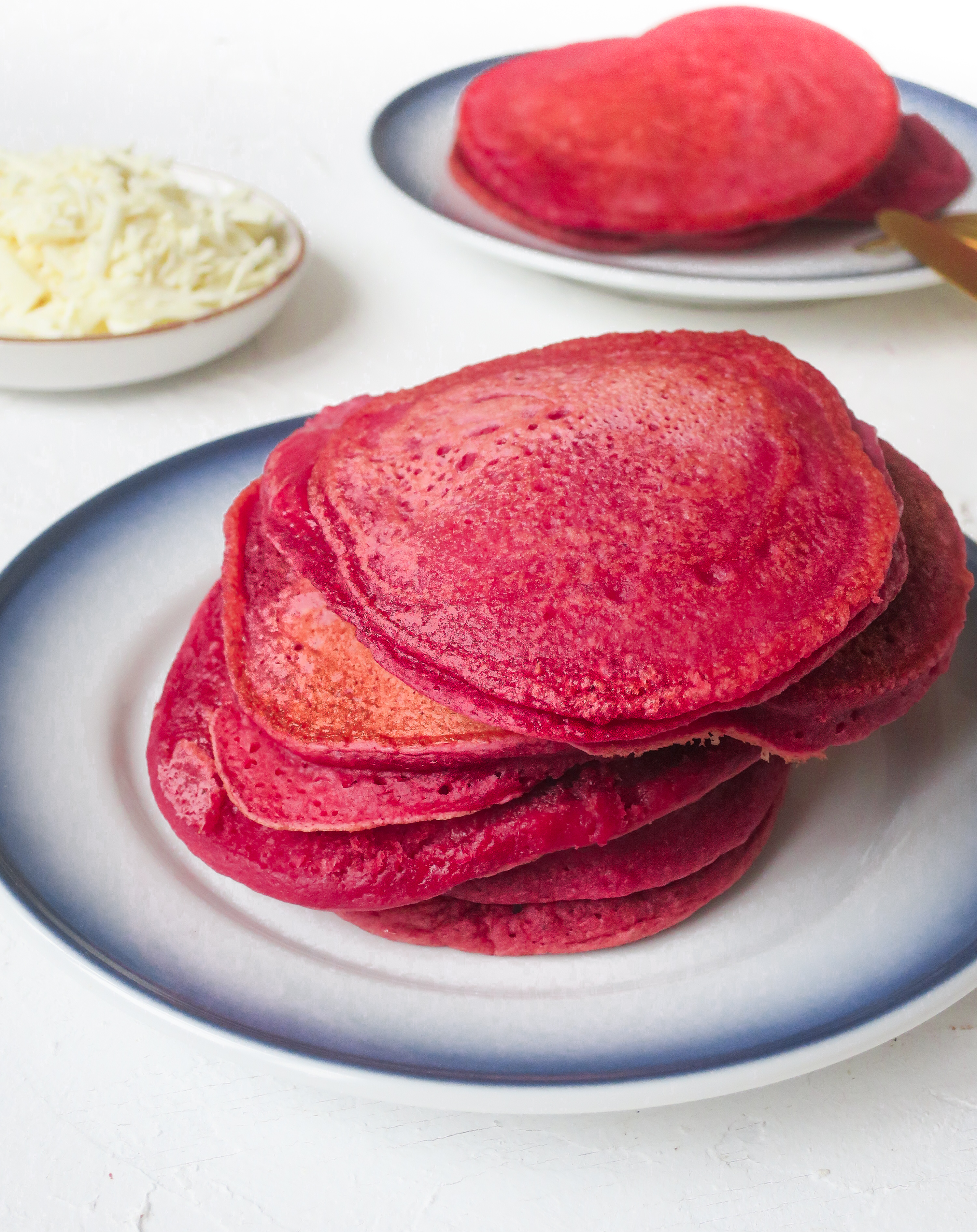 Red Velvet staat vaak gelijk aan onnatuurlijke kleurstof. Maar waarom zou je kleurstof kopen als je ook op een natuurlijke manier rode pannenkoeken kunt creëren? Dat bedachten wij ons toen we merkten hoe makkelijk het is om pannenkoeken te maken met… rode biet!
