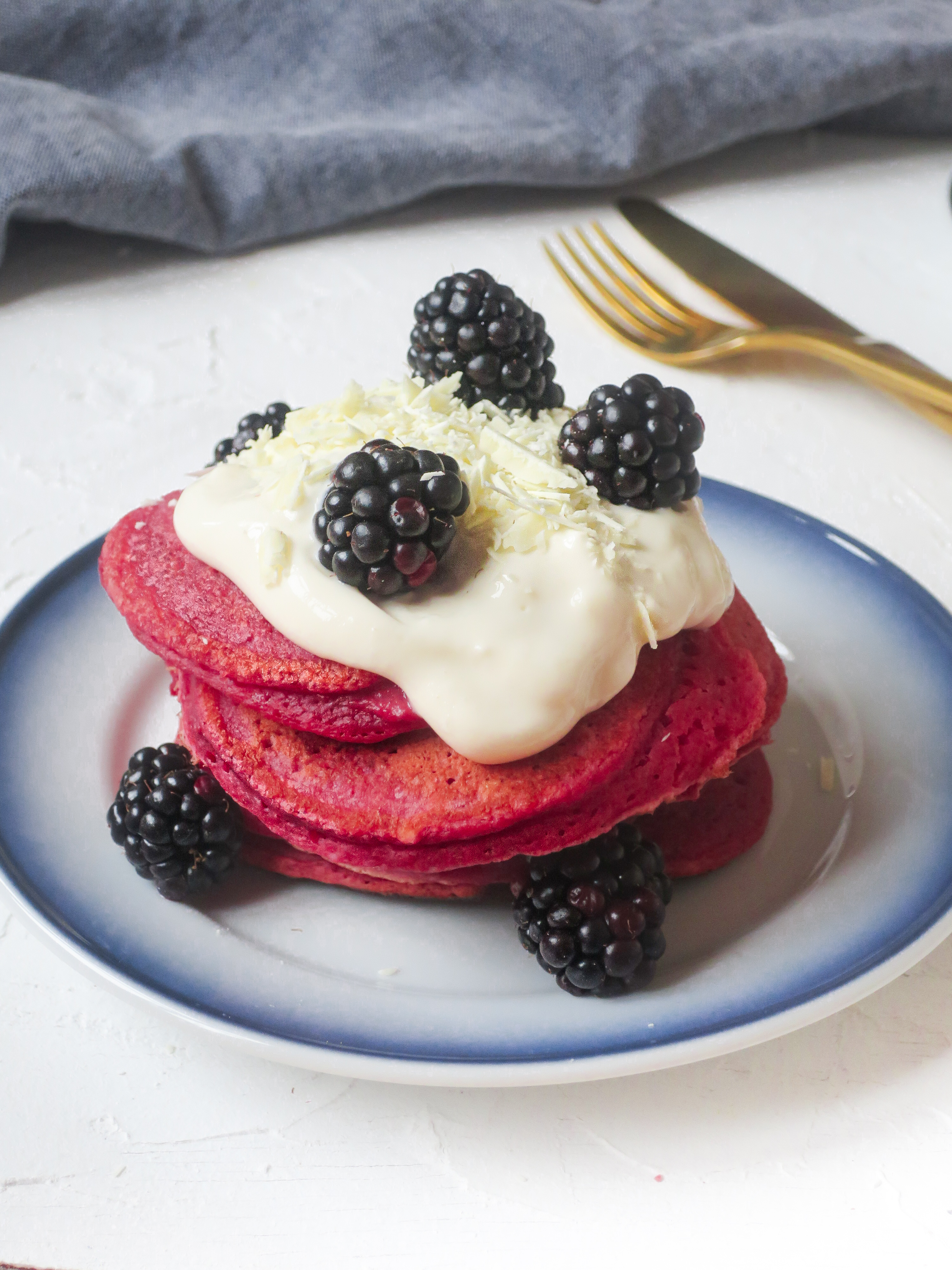 Pannenkoeken zijn sowieso al een behoorlijk dankbaar gerecht om op tafel te zetten, maar róde pannenkoeken, die zorgen geheid voor een extra wauw-factor. Wij maakten deze Red Velvet pancakes met een eenvoudige cream cheese topping, blauwe bessen en witte chocoladekrullen. Feest!