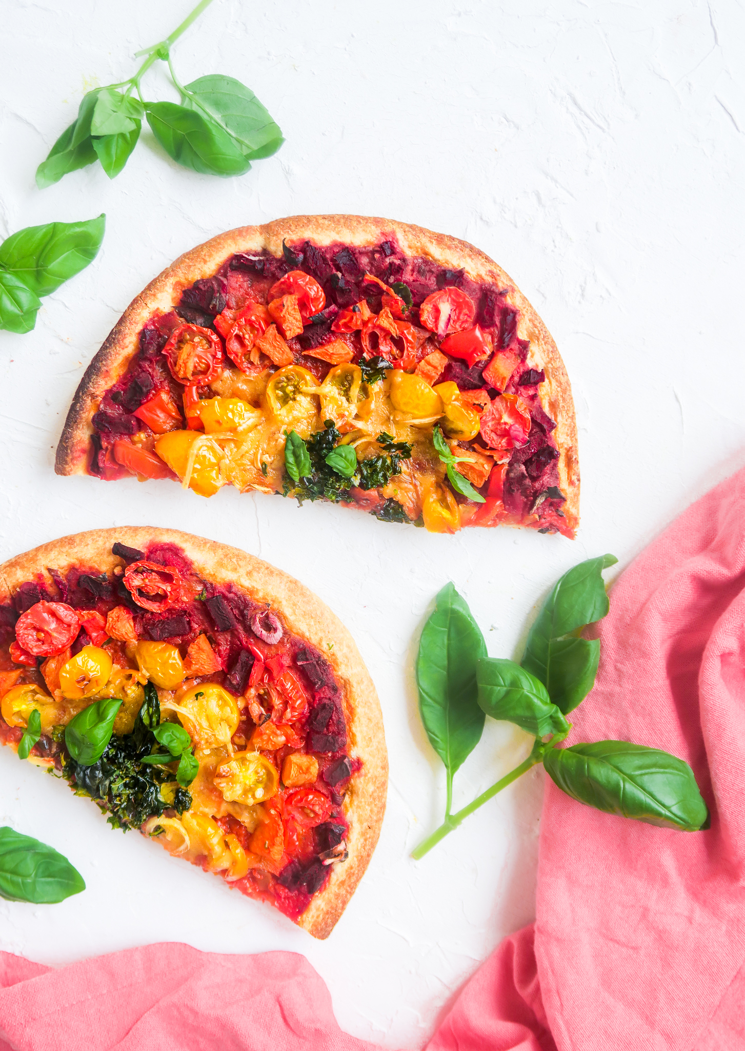 Halveer de pizza tenslotte zodat er twee helften in regenboogvorm ontstaan. Werk af met extra verse basilicumblaadjes.