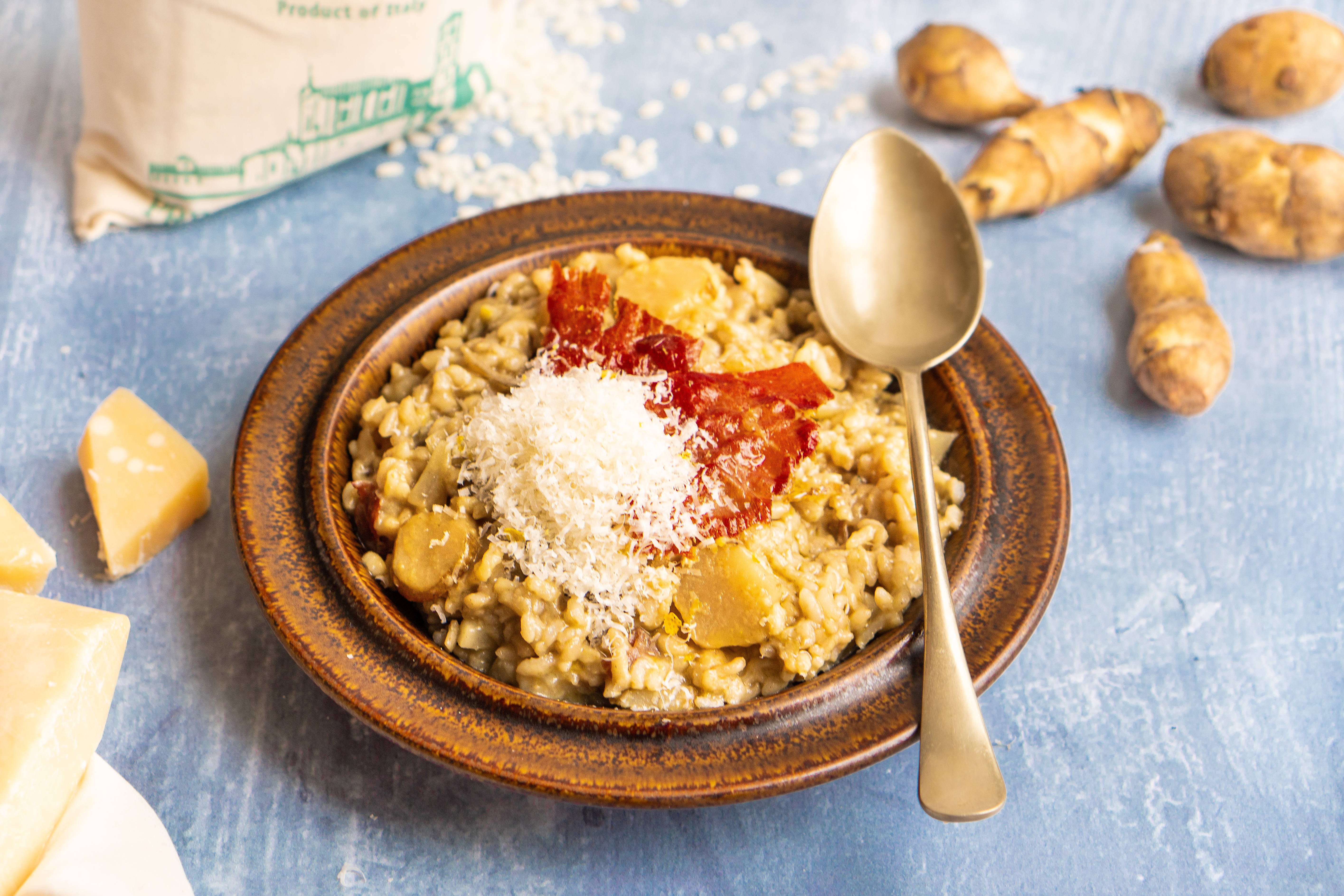 Onze vreugde kon niet op toen we de eerste aardperen in de winkels zagen liggen. We besloten om ze te verwerken in een romige risotto met aardpeer en krokante Serranoham. Wat een droomcombinatie!
