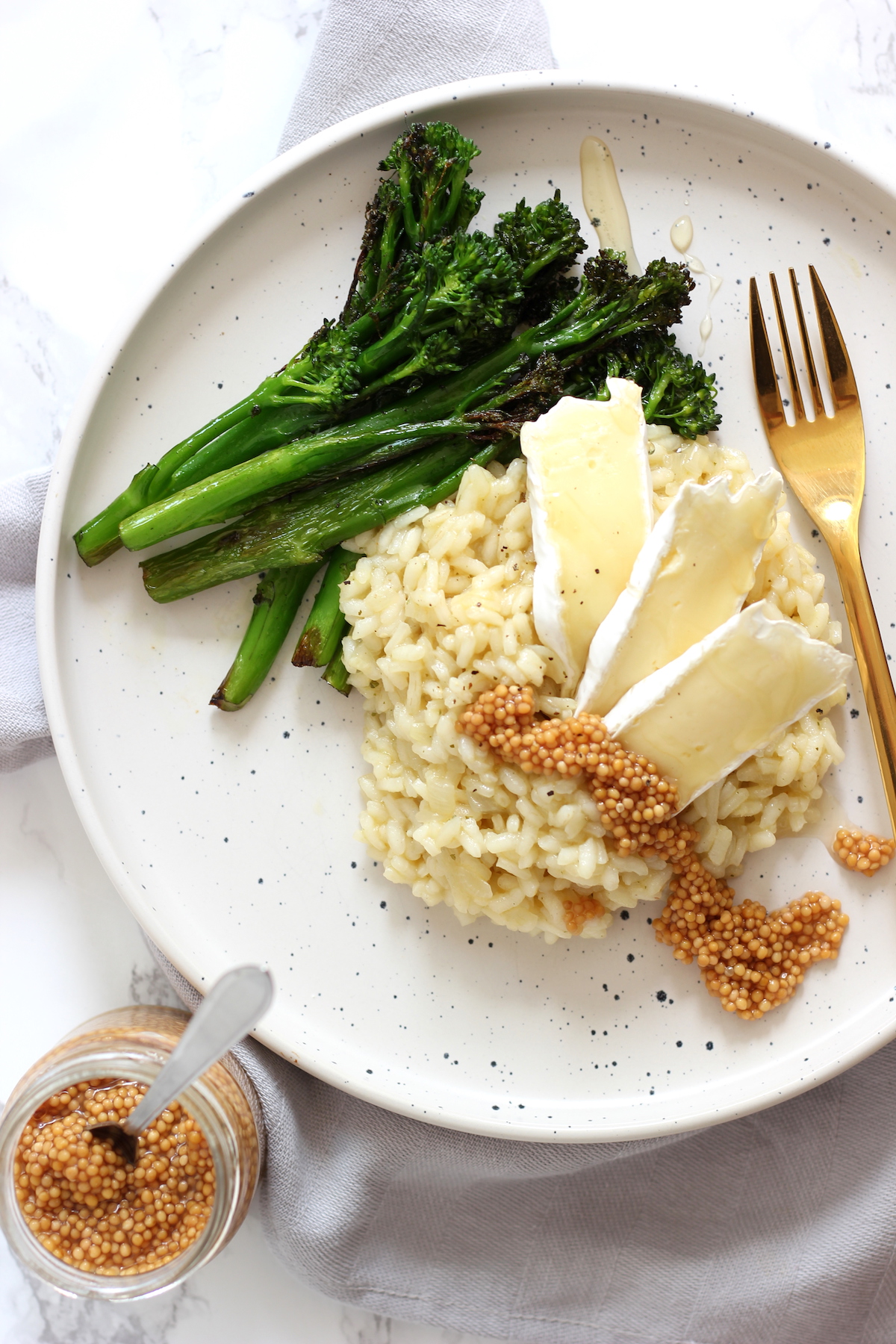 Risotto met brie, geroosterde bimi en ingemaakt mosterdzaad