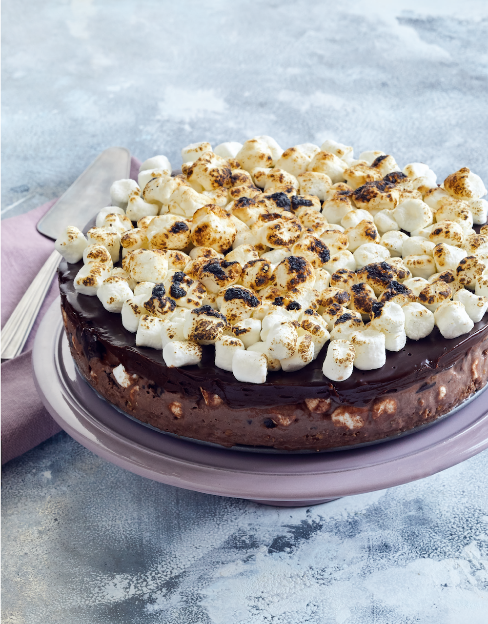 Strooi de overgebleven 75 gram marshmallows over de taart. Bruin de marshmallows desgewenst met een keukenbrander. Serveer de rocky road ijstaart meteen.