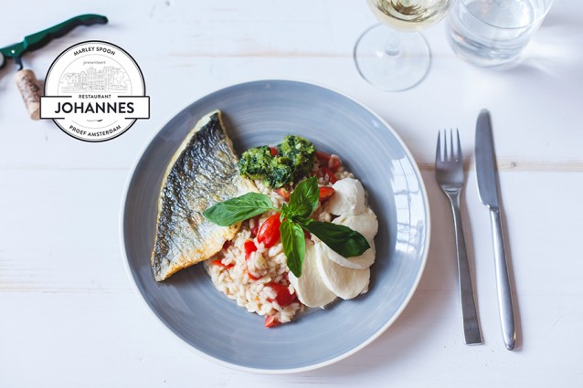 Een romige risotto caprese met knapperige doradefilet, door chef Tommy den Hartog van restaurant Johannes speciaal gemaakt voor Marley Spoon.