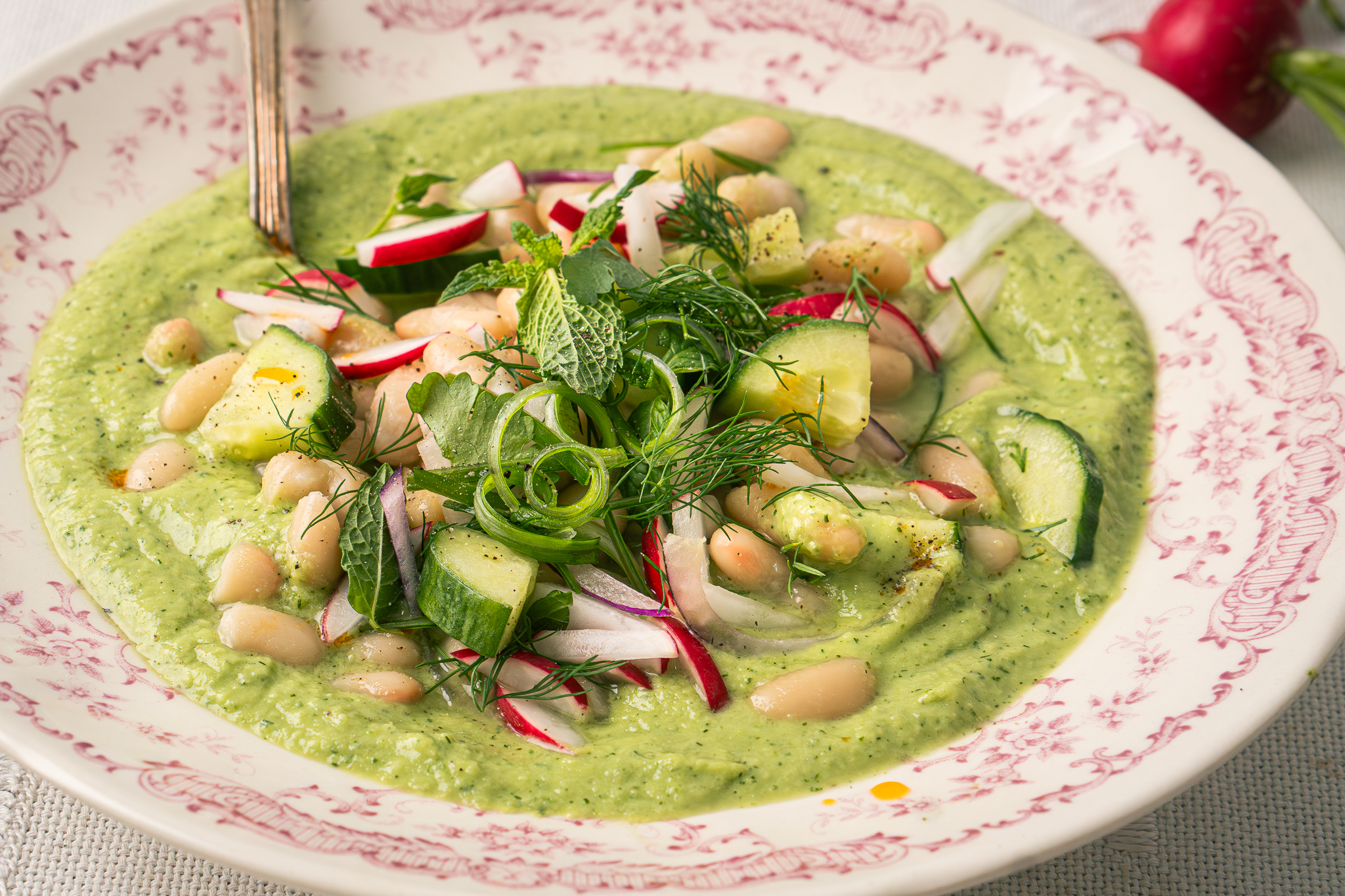 Romige witte bonen in gazpacho-achtige groene saus (verkoelend bij warm weer!)