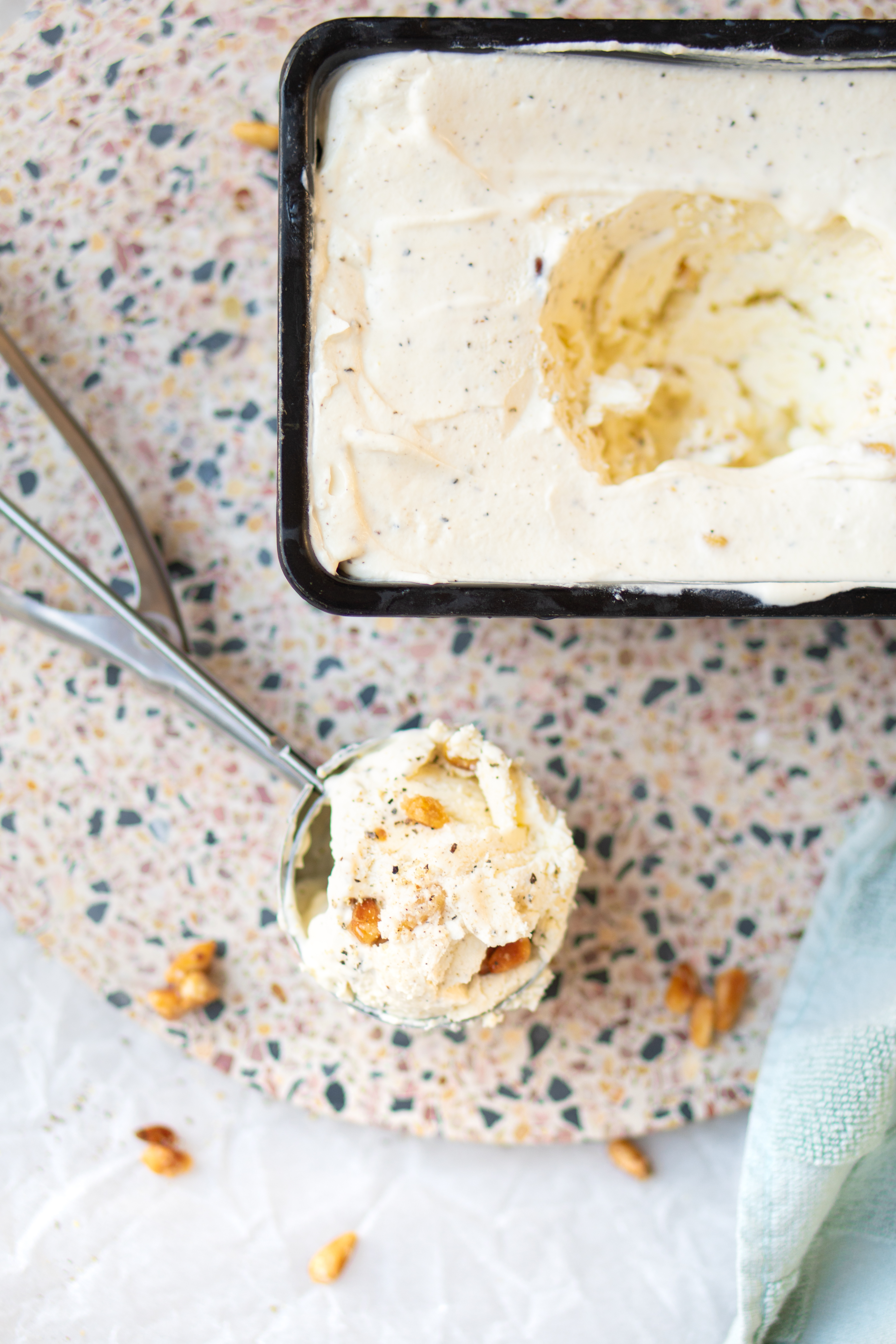IJs met zwarte peper, zeezout en krokante pijnboompitten