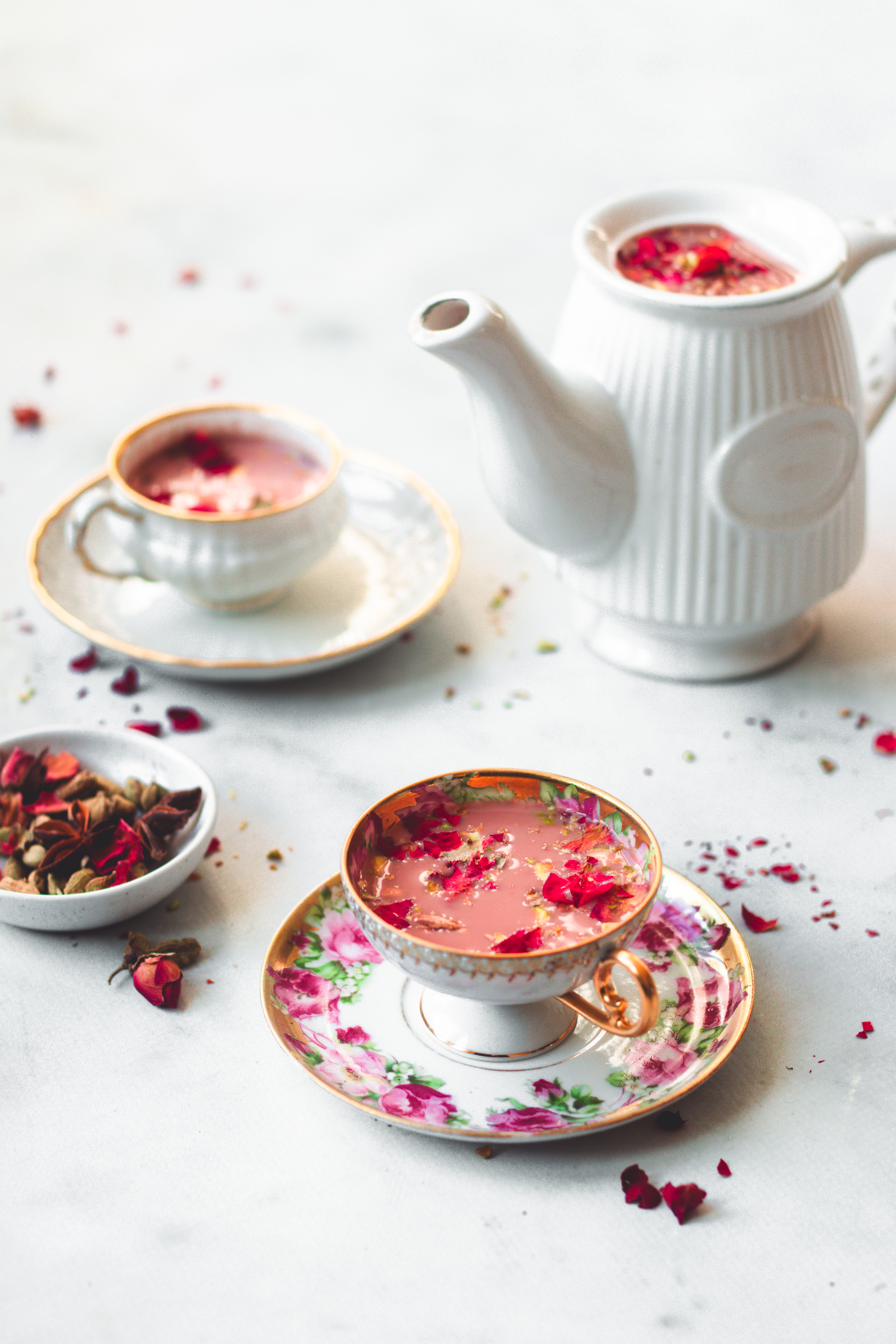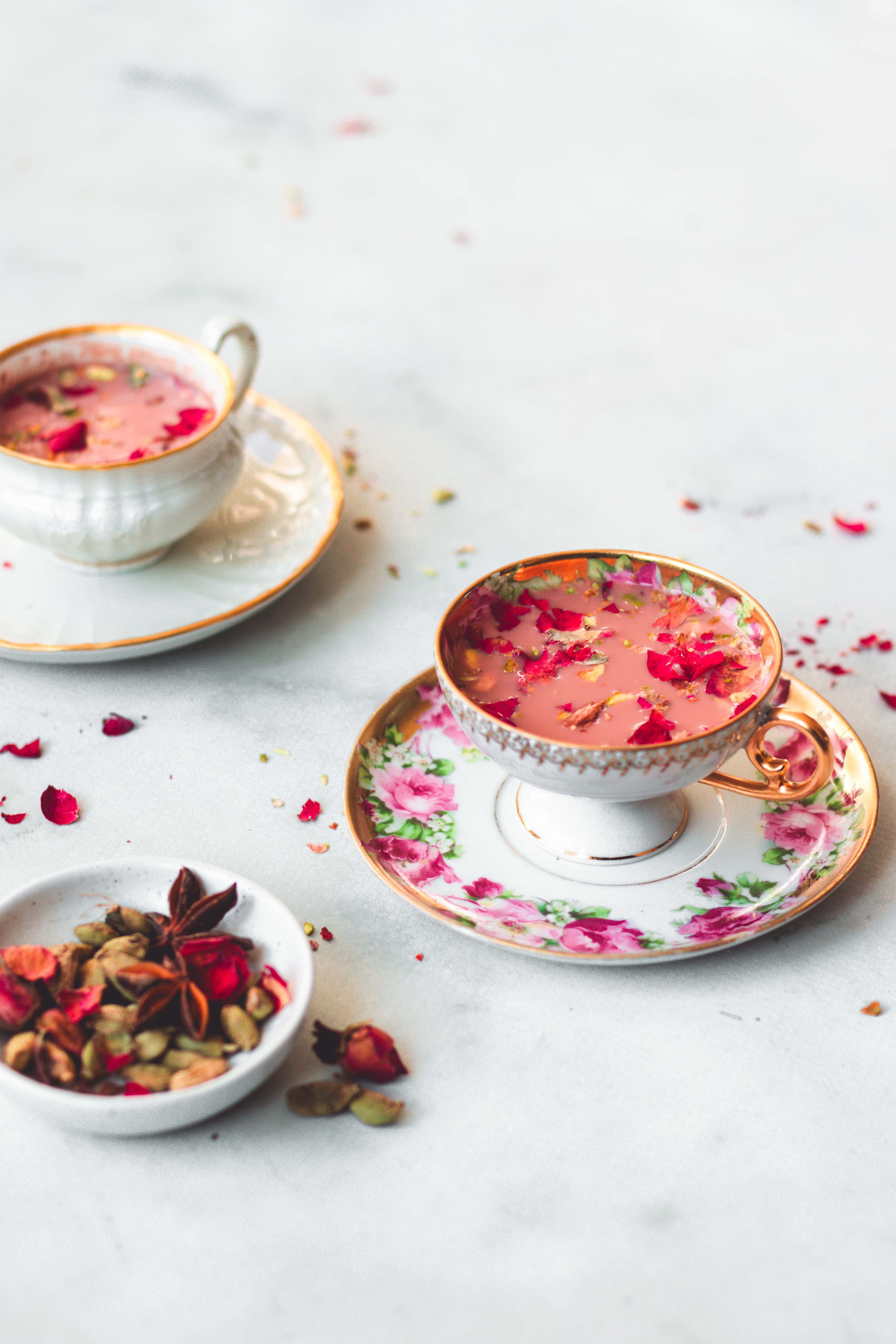 Door een chemische reactie kleurt deze thee roze. In combinatie met verwarmende specerijen en rozenblaadjes krijg je Pakistaanse kashmiri chai: het meest romantische warme drankje ooit.