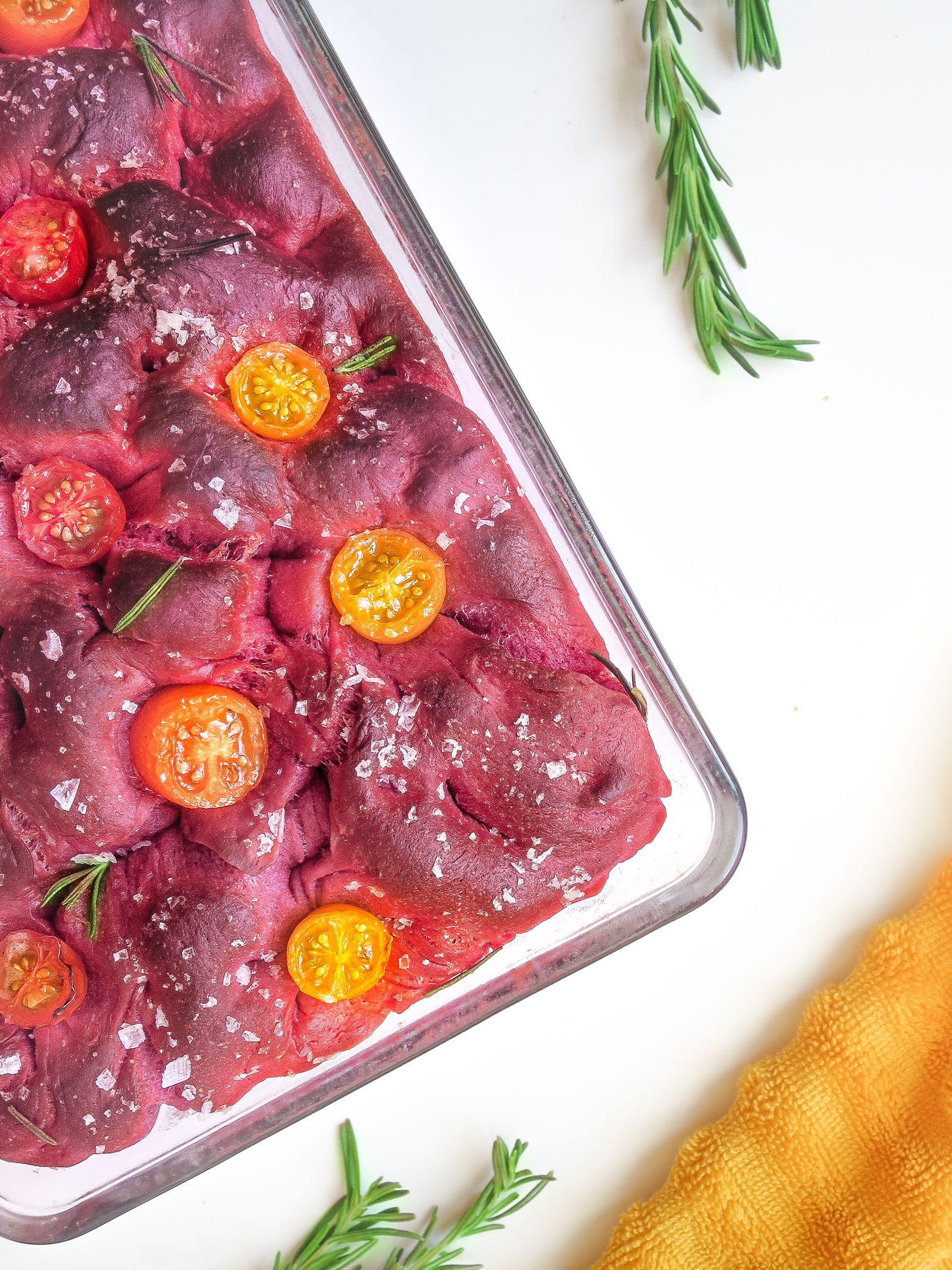 Roze focaccia met kerstomaatjes en rozemarijn